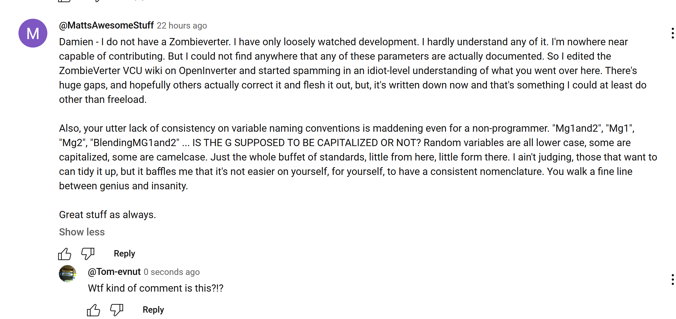 So, for context: I barely know how to code. I'm not an engineer. I barely understand even a surface-level of what the Zombieverter does. I'm not capable of contributing. I don't happen to use the Zombie VCU, so I don't have a dog in this fight. So that out of the way...