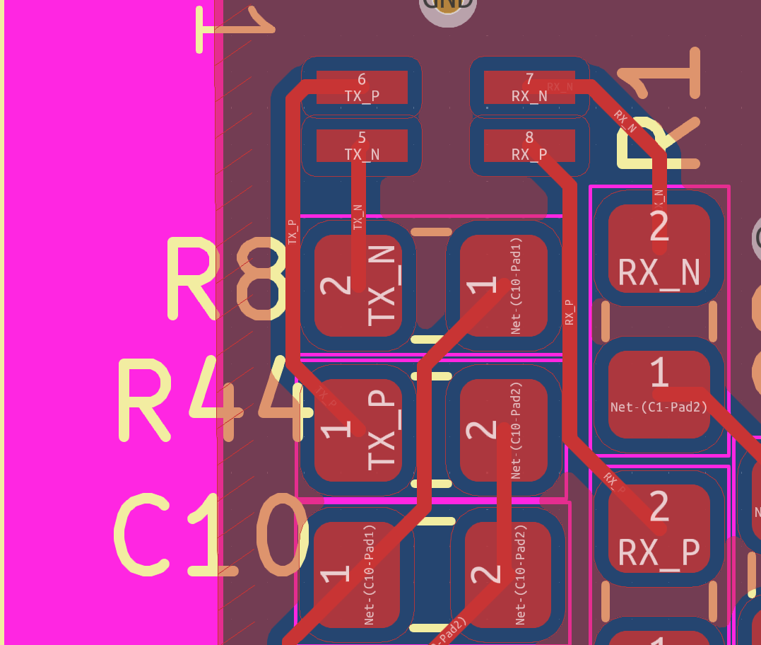 - For the C77-C80 + area there is 1 thin ground for a string of 9? capacitors & resistors. I'd suggest bumping them over a bit and adding a top local thermal relief GND plane with a bunch of stitching vias to gnd. I always try to stitch ground pads to the inner ground plane just to avoid issues.