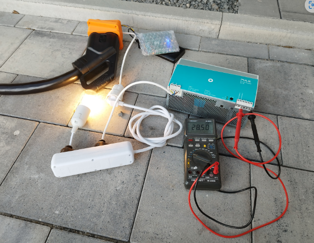Good news: The transformerless Foccci works on the Alpitronic charger. Here driving a 230V bulb (just because it's nice) and a 24V/20A power supply (which will be the use case later).