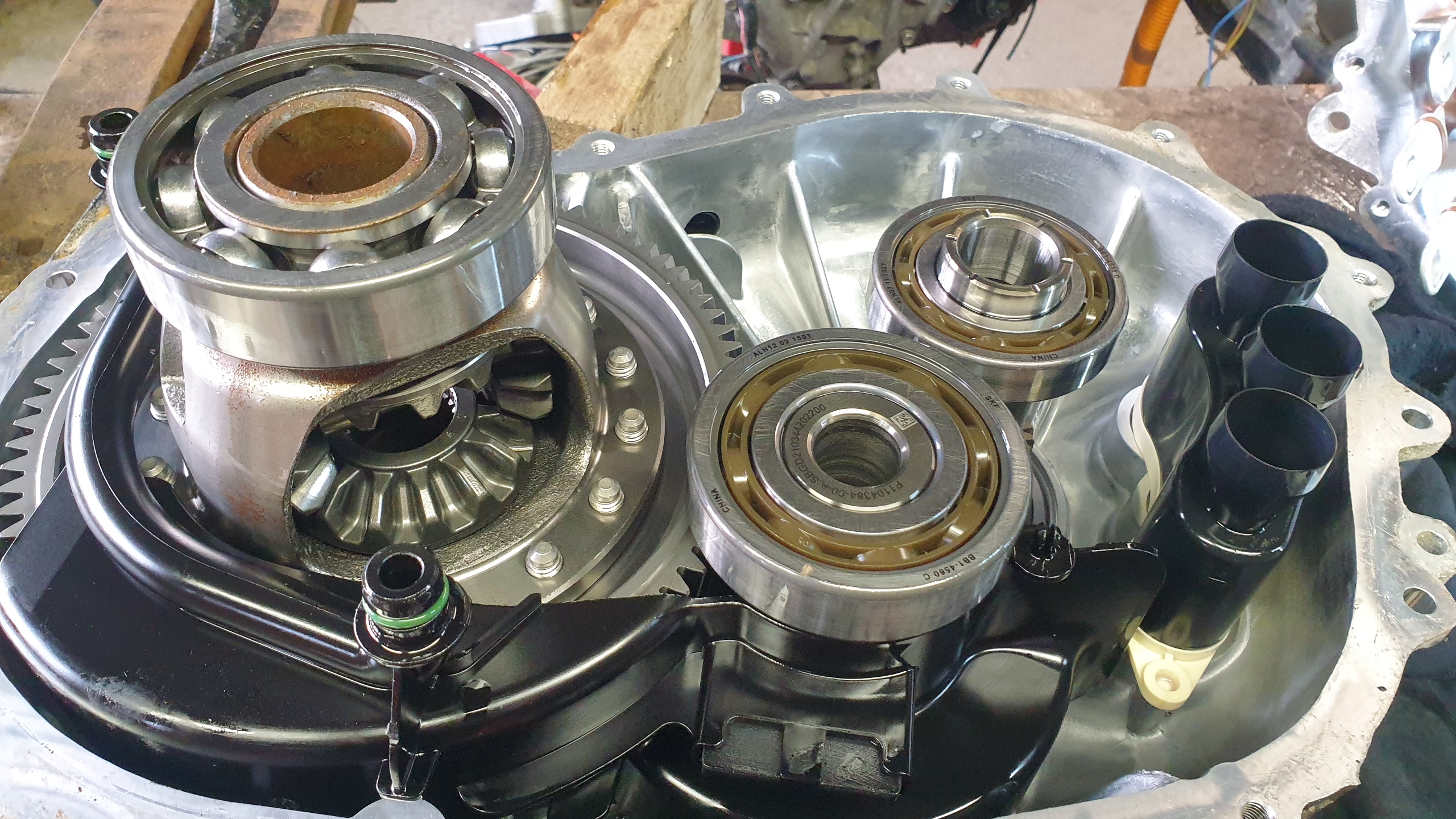 This hole connects to the top right hole via a plastic tube (seen in the other photo). Oil then passes through the heat exchanger (across the top of the case), then exits back into the case via another hole. Another tube splits the oil from there to the hole right next to it(which feeds the motor) and y’s off to the other case half. On the other car half the oil is pumped through the input shaft and intermediates shaft bearings.