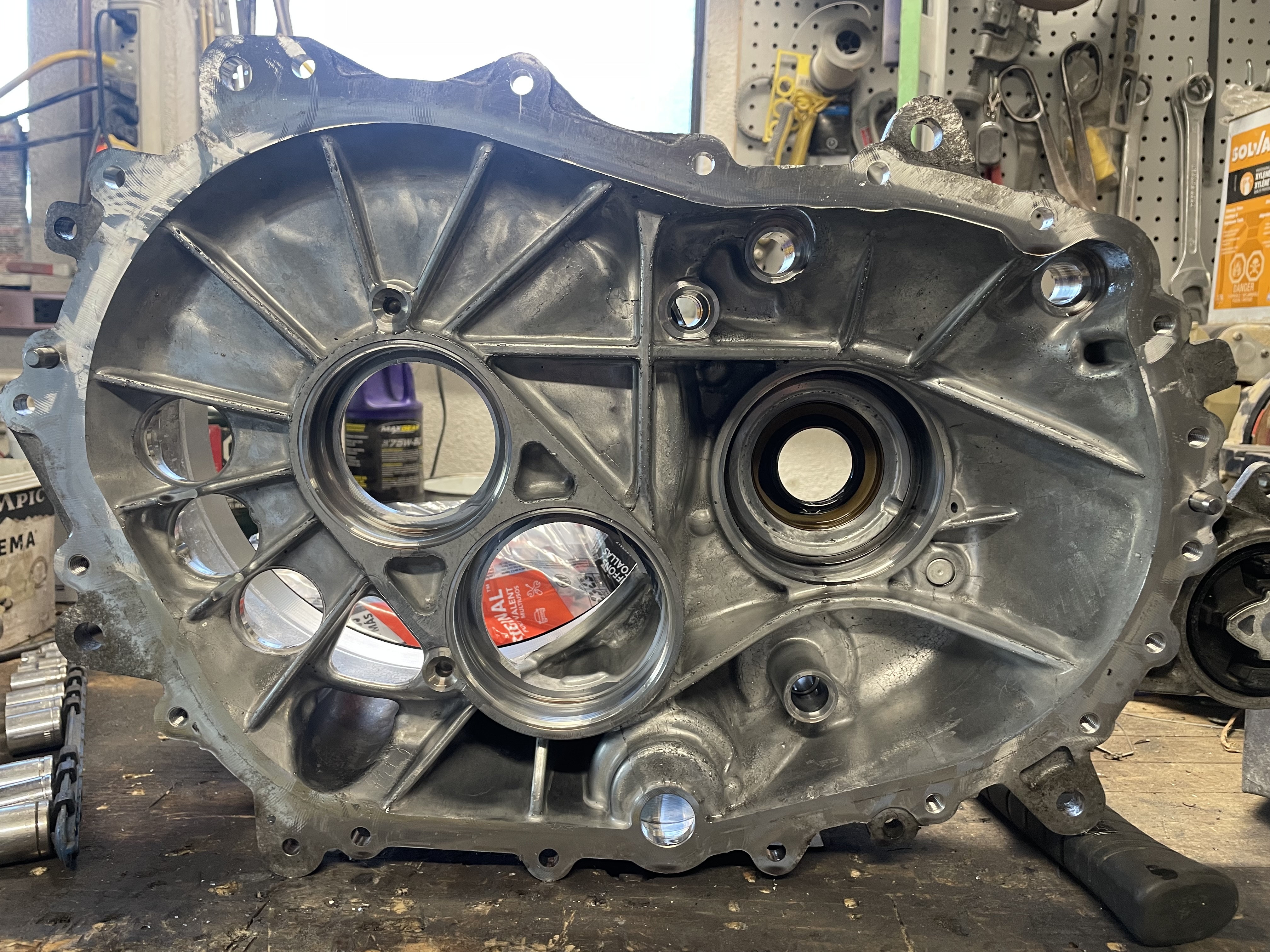 Here’s the other case half where you can see where the oil tube inserts and routs the oil into the bearing bores