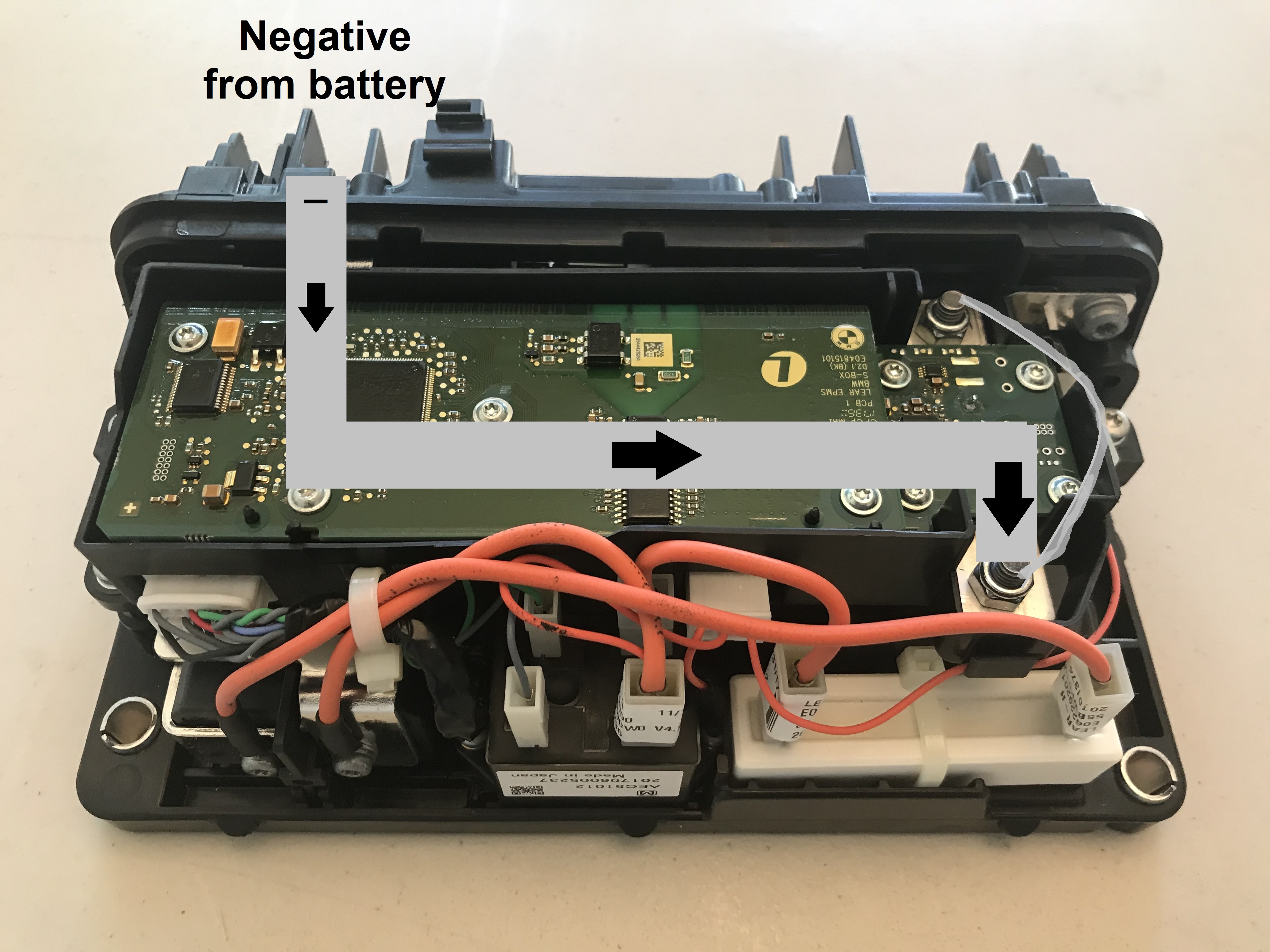 the actual Gen 1 (9 kWh) battery pack sBox guts showing the negative current bus bar running through the current shunt