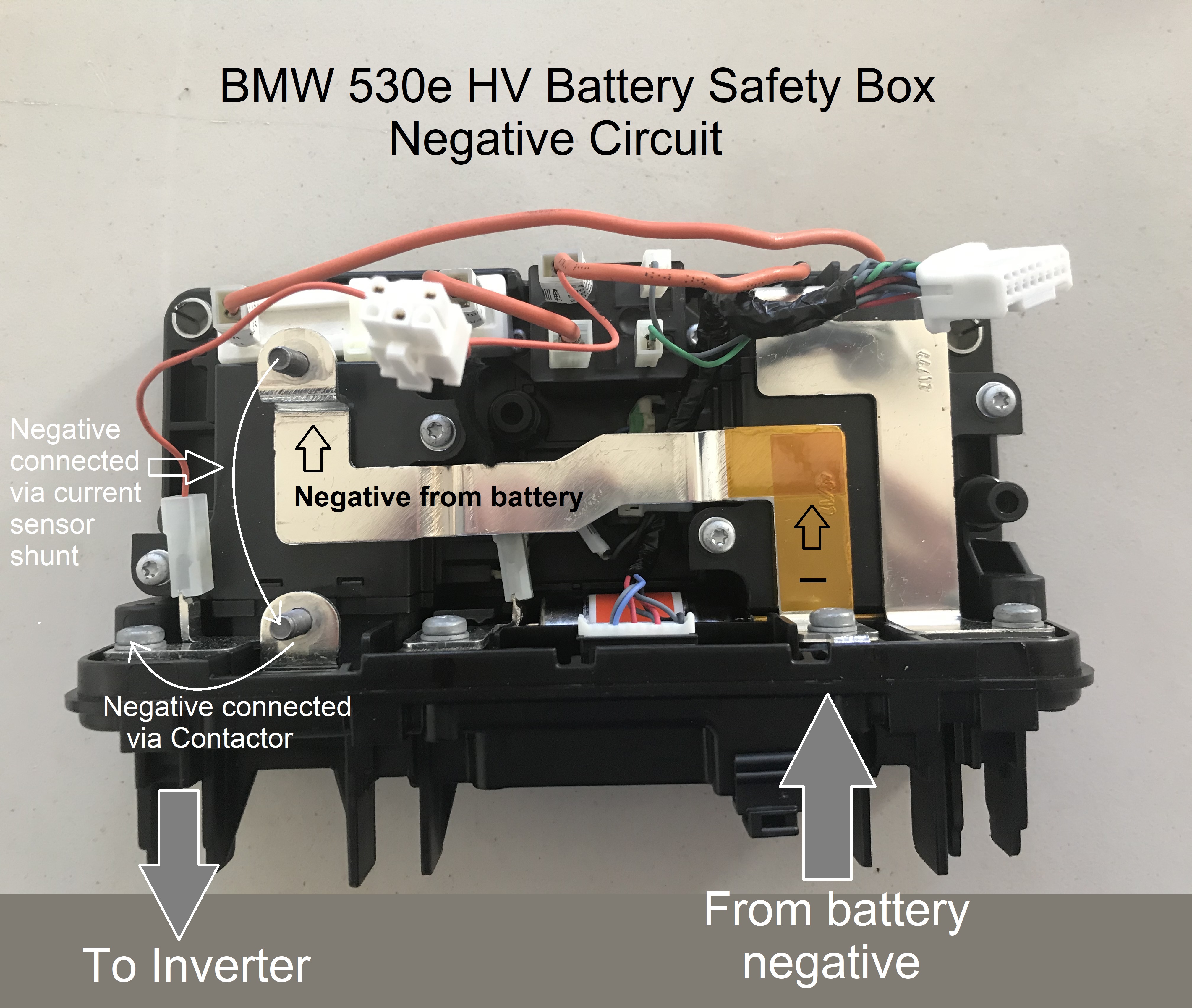 so continuing to beat the sBox dead horse to death, here is what the negative connection looks like inside the OEM BMW Safety Box ie the contactor box, before the negative lead coming from the battery pack reaches the "negative" contactor [note: both the positive and negative contactors are the exact same pieces of kit, and can be used interchangeably, we just call one negative and the other positive for reference, sometimes the positive contactor is called the "Main" contactor] it goes through a current shunt, shunt meaning sensor