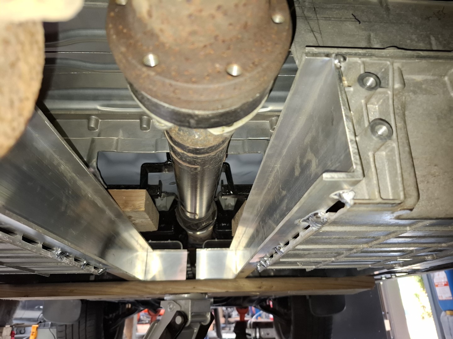 Got the aluminium welded battery box back and working on a mounting detail that makes use of the original battery box mounting frame. Keeping the original transfer case and the rear prop over complicate things a little!