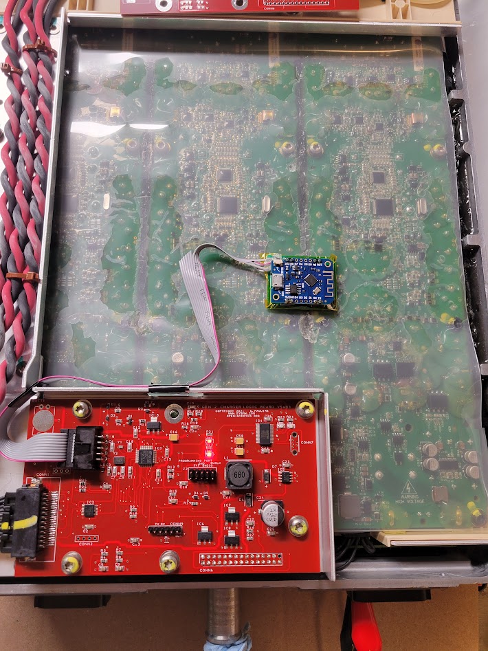 Finally, quick note to anyone doing this in the future, if you get the WEMOS wifi board you will need to mount it remotely. If you use the 90 degree plug it will sit too high to close the case of the charger. You can't solder the adapter directly to the board without blocking a screw hole, although you might be able to adjust the gerber to move the adapter board away from the mounting hole. My solution, at least for testing, was to solder a ribbon cable from an old 3d printer directly to the adapter board and plugged into the logic board as normal.