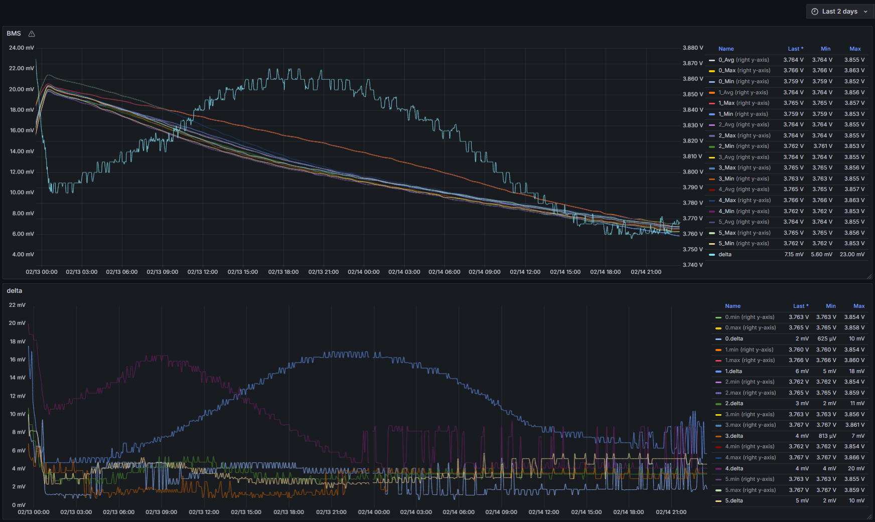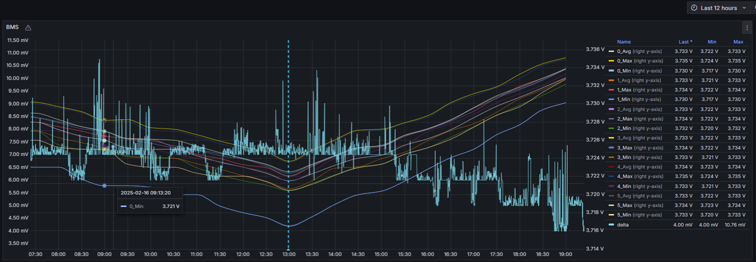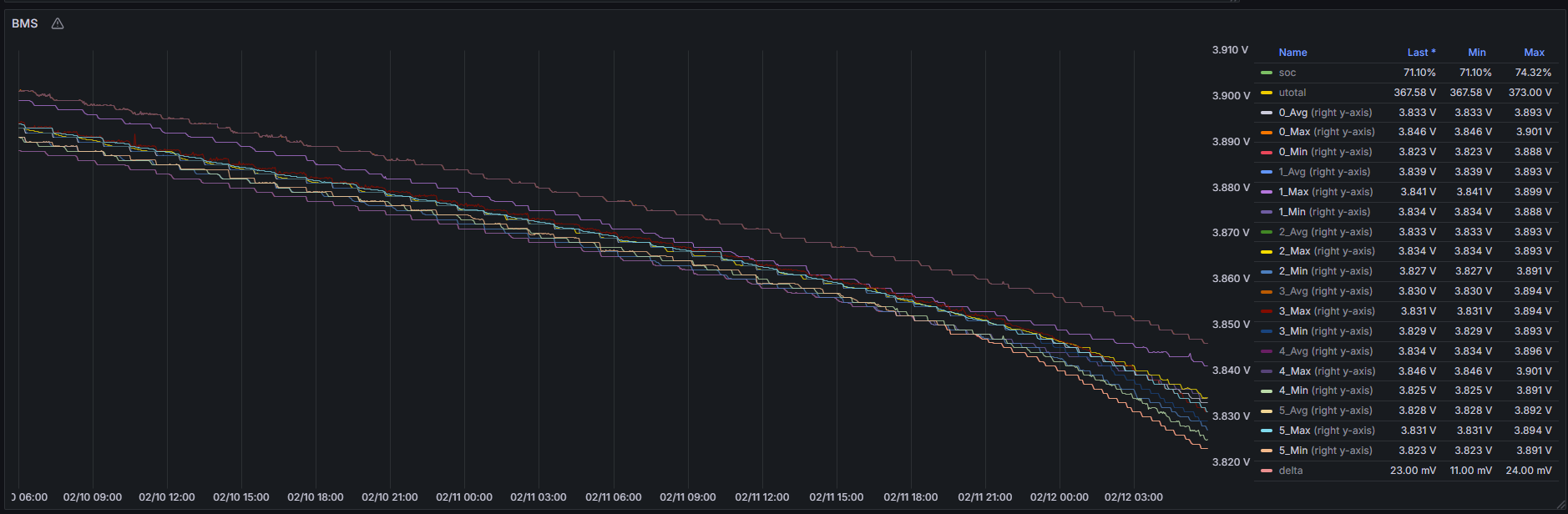 Here’s a log showing min/max voltages across all boards. BMS0 values represent the whole pack.