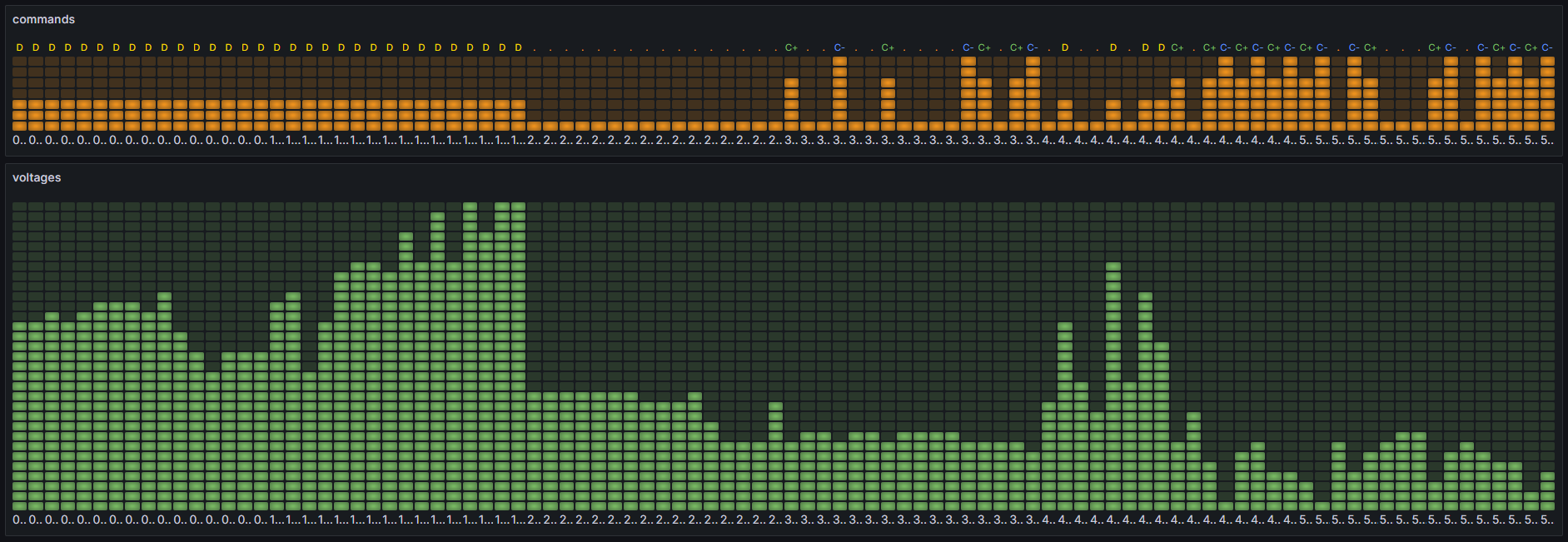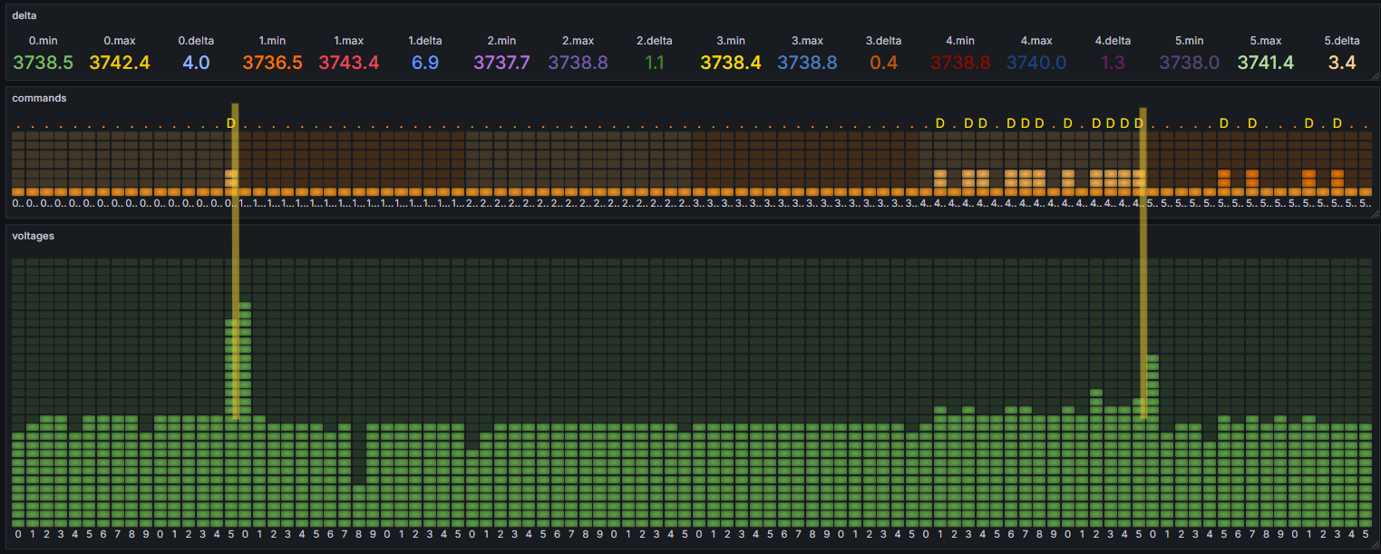 Here’s how it looks on the dashboard - top chart shows the command per cell (0–3), bottom chart shows cell voltages, zoomed into the important range.