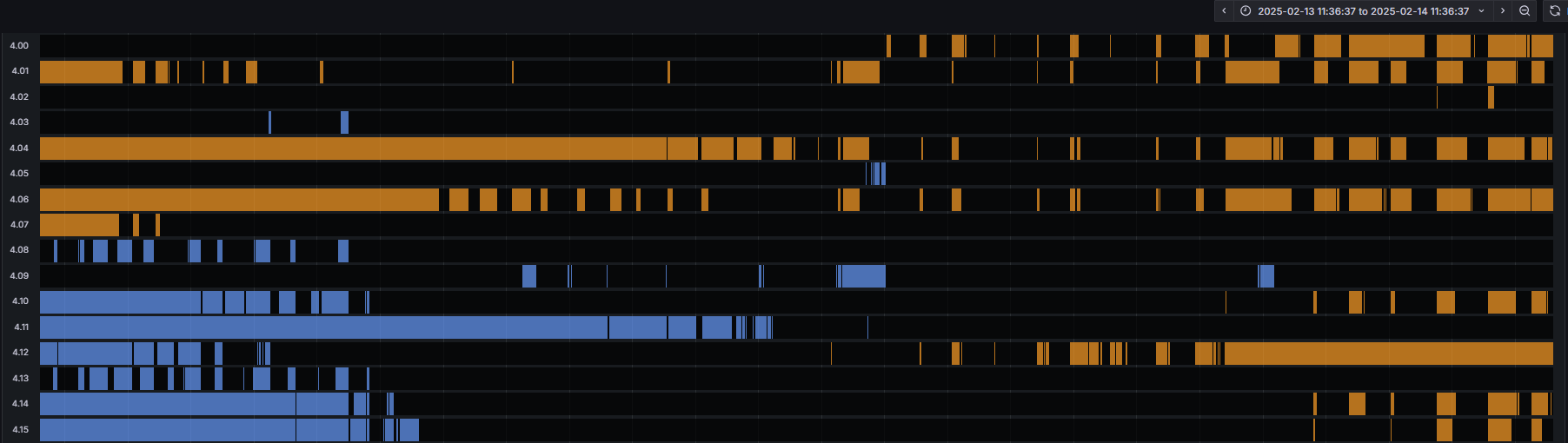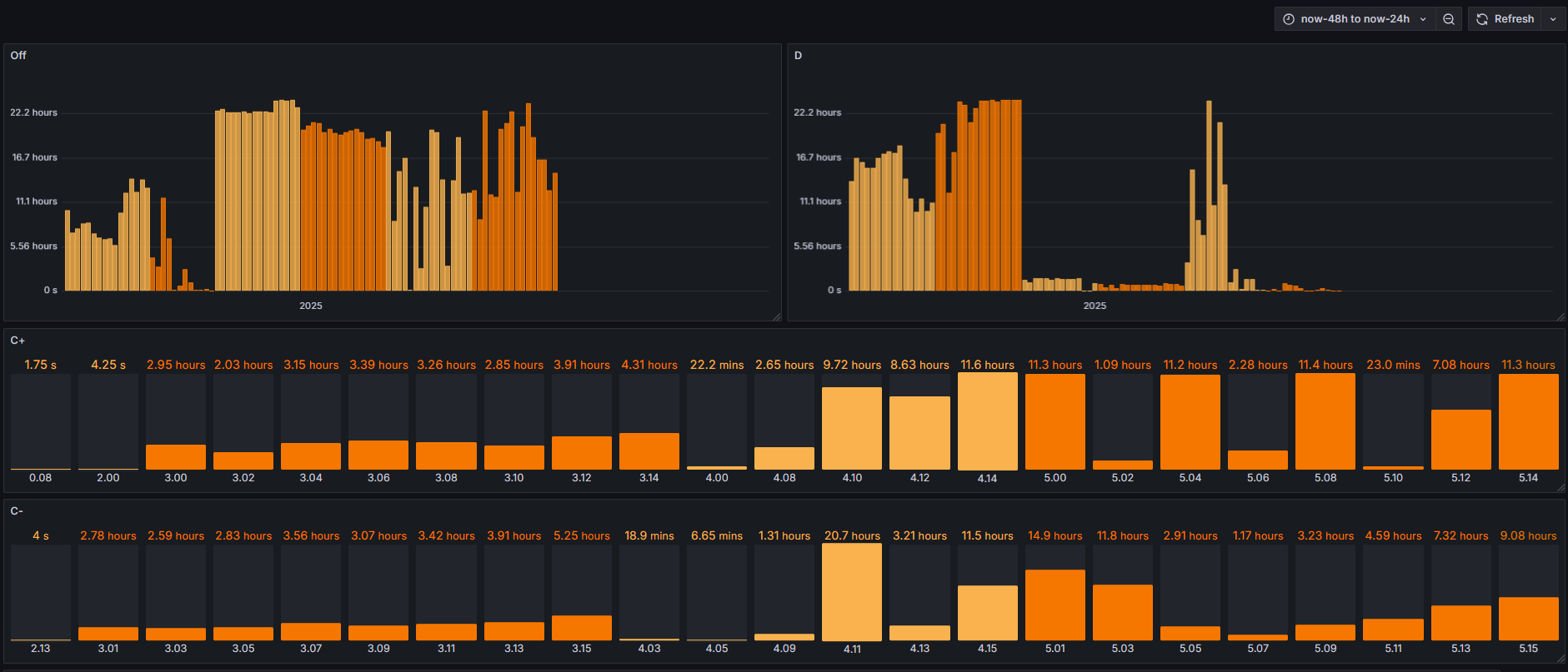 I wanted to pull out balance states durations for each cell. Since I have detailed logs from BMS for the last two days, data is there, but I’m having trouble labeling graphs with many bars, like status OFF and DISCHARGE. Graph displays only cells that were in that state, not all 96, making it hard to read... Maybe I’ll revisit it later.