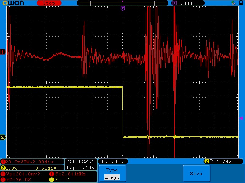 Red: current sensor signal Yellow: is ch3 PWM (for timing)
