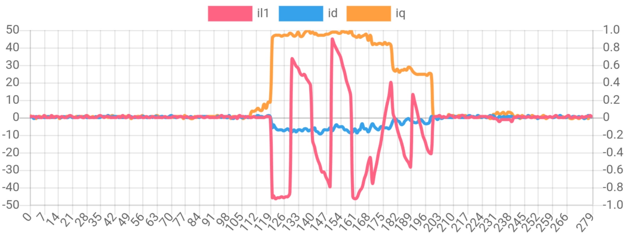Took a plot on the web interface. So at 50A throttle Iq is 50A and there is some Id current resulting in the 107Ap/p on the scope.
