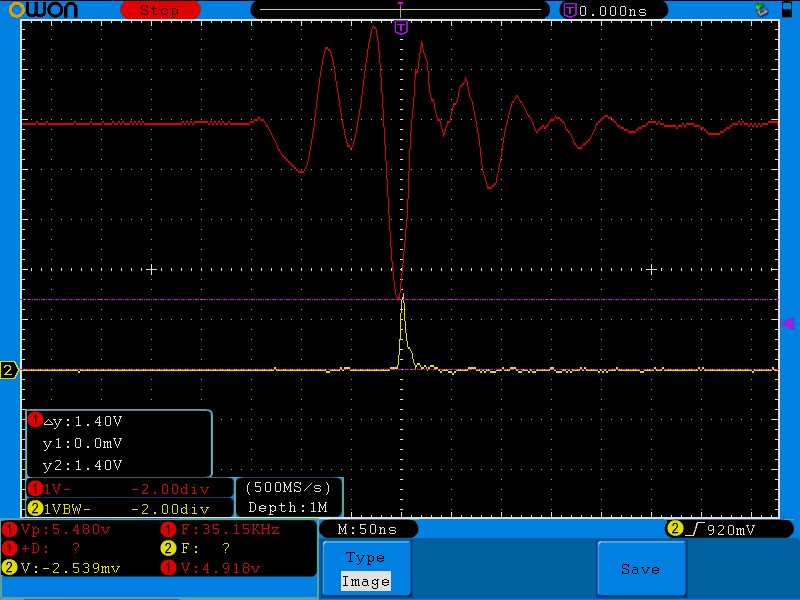 red=current sensor yellow=NAND Zoomed So the interrupt pin is triggered by the NAND gate. Next I soldered the scope to capacitor on the desat track.