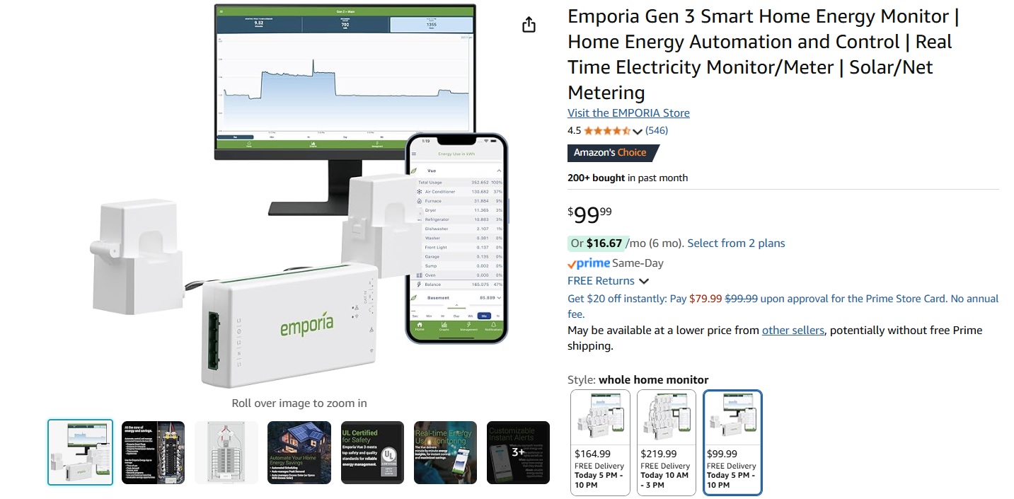 Note that Emporia does not make 240 volt smart plugs so we have to switch to their Vue Monitor and use a hall effect current sensor