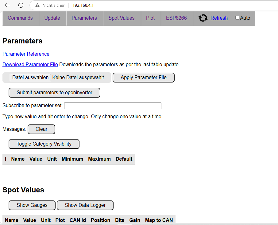 I had tried to update my ZombieVerter via the WebUI but afterwards the paramters and spot values option are not visible. I further tried restoring the Zombie using the ST Link and cleared the memory and tried it with V2.17a and V2.20a but no change. The Software states succes so I hope it actually did something. If I download a parameters file it is empty, so that changed for sure. Any tipps to get back at it? And or does someone have a paramters file for the GS300h? I am confident this motor will spinn soon enough.