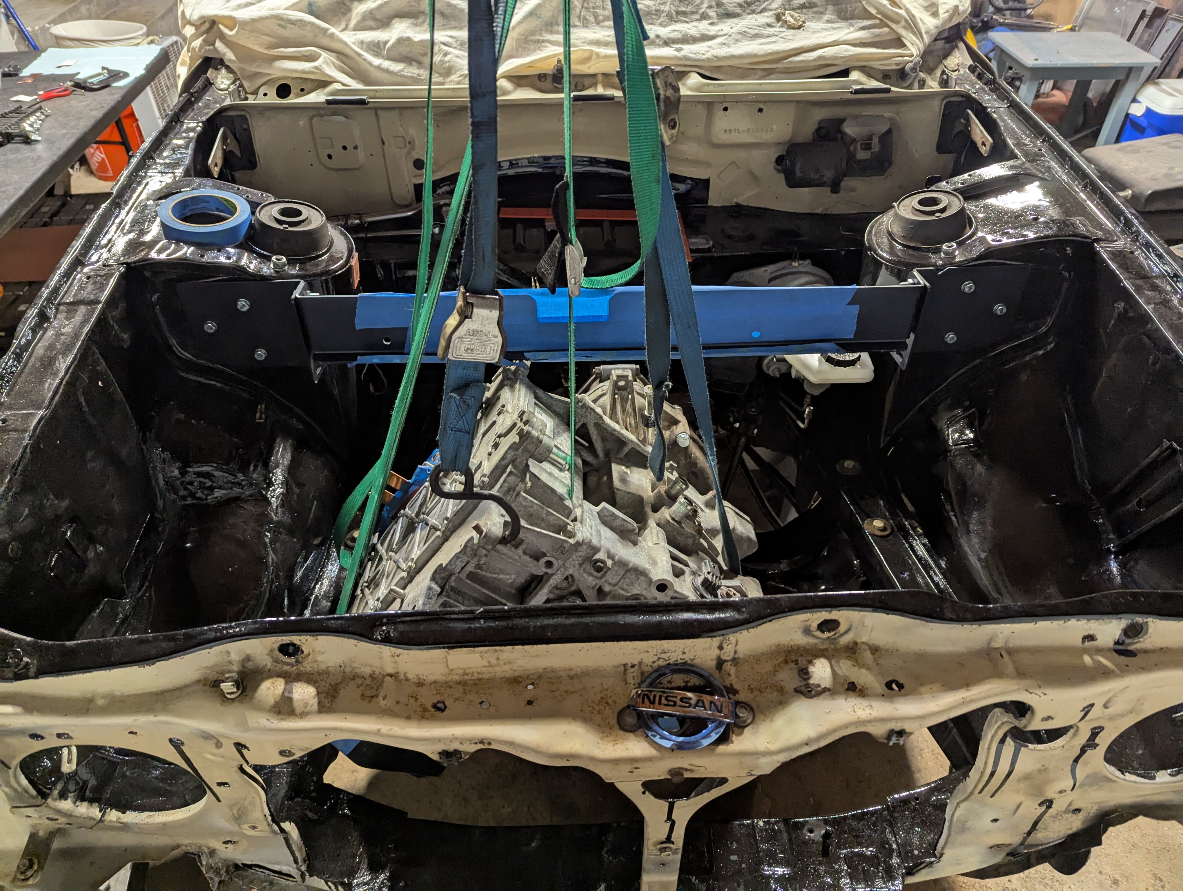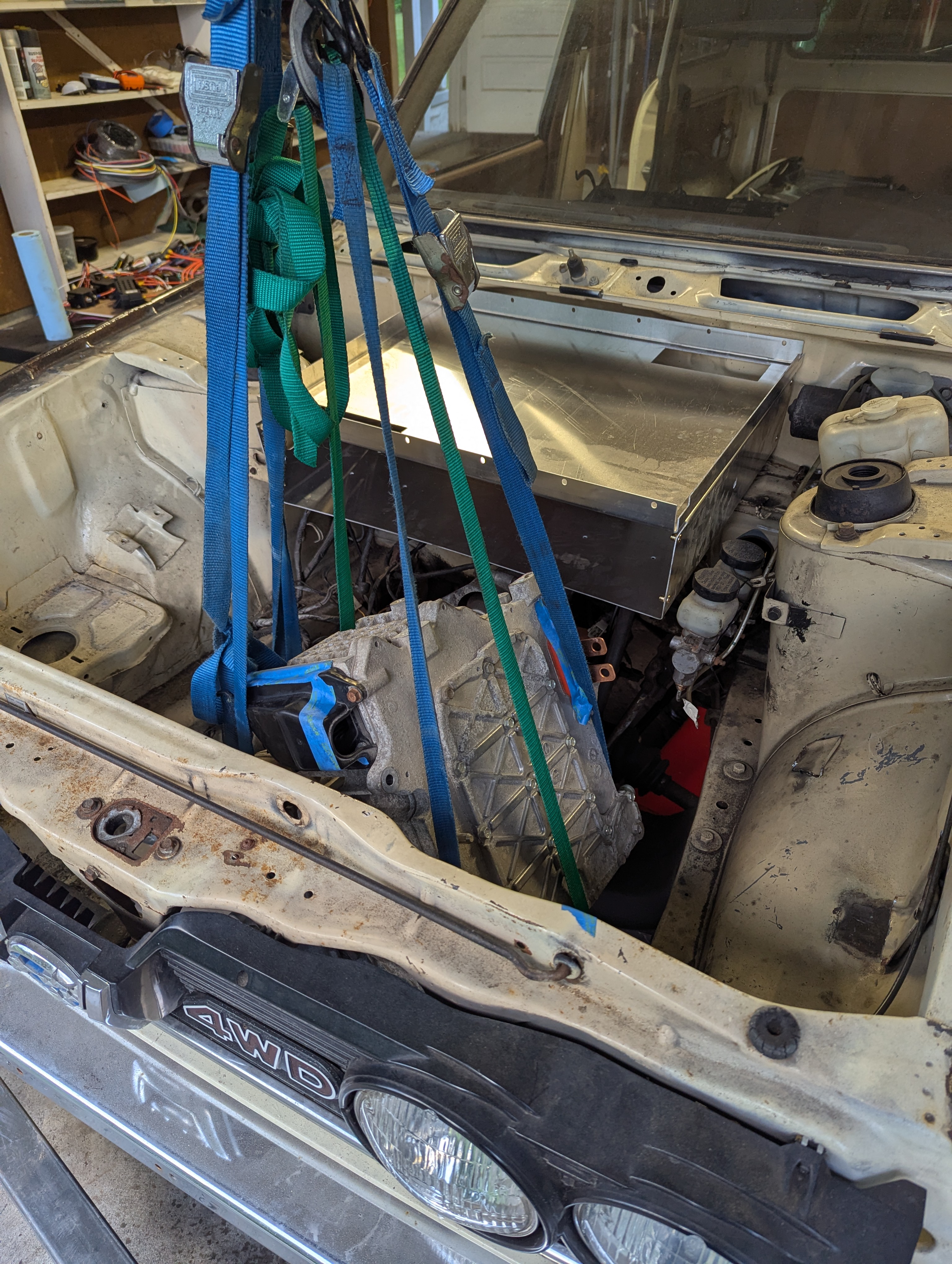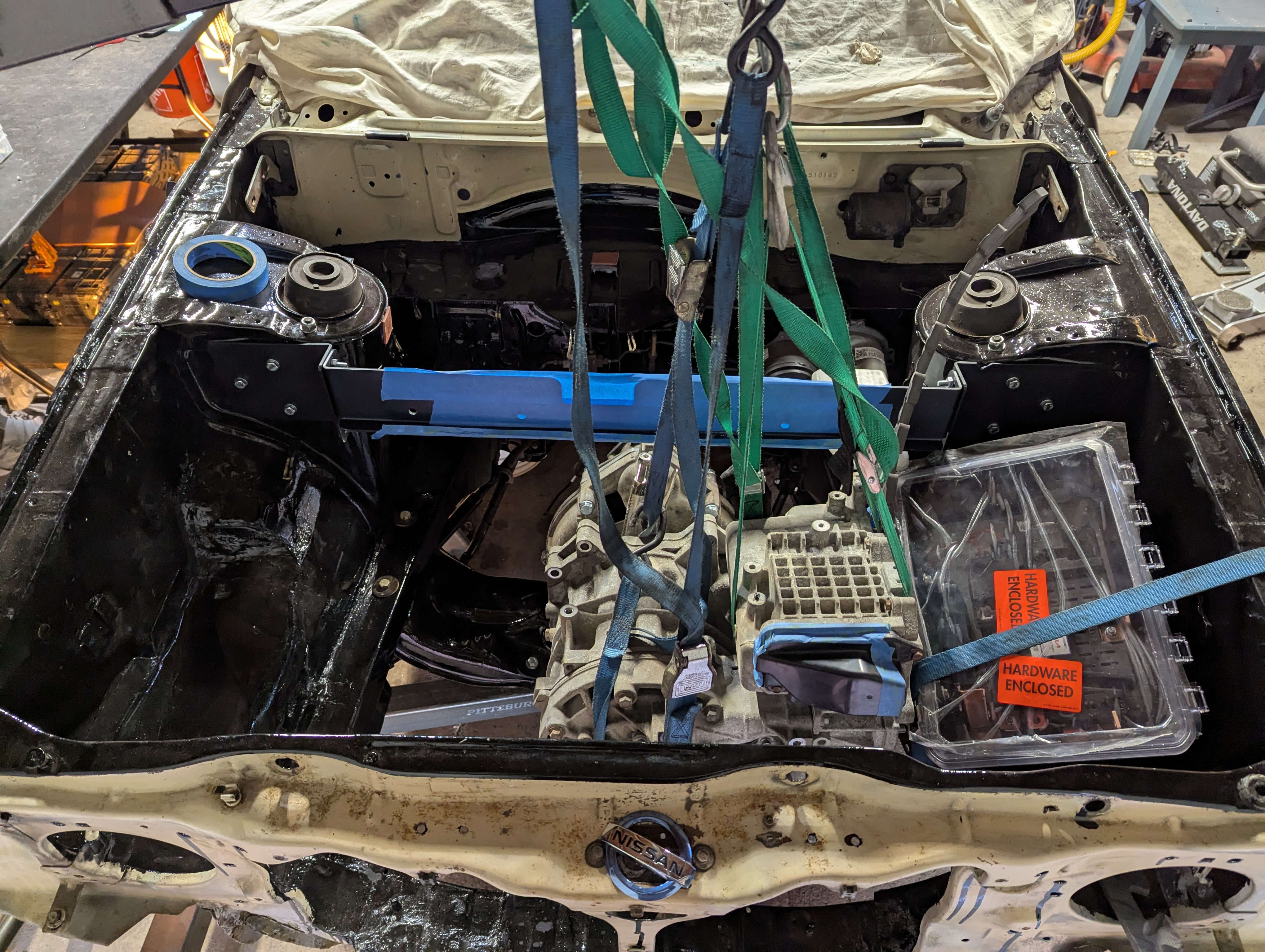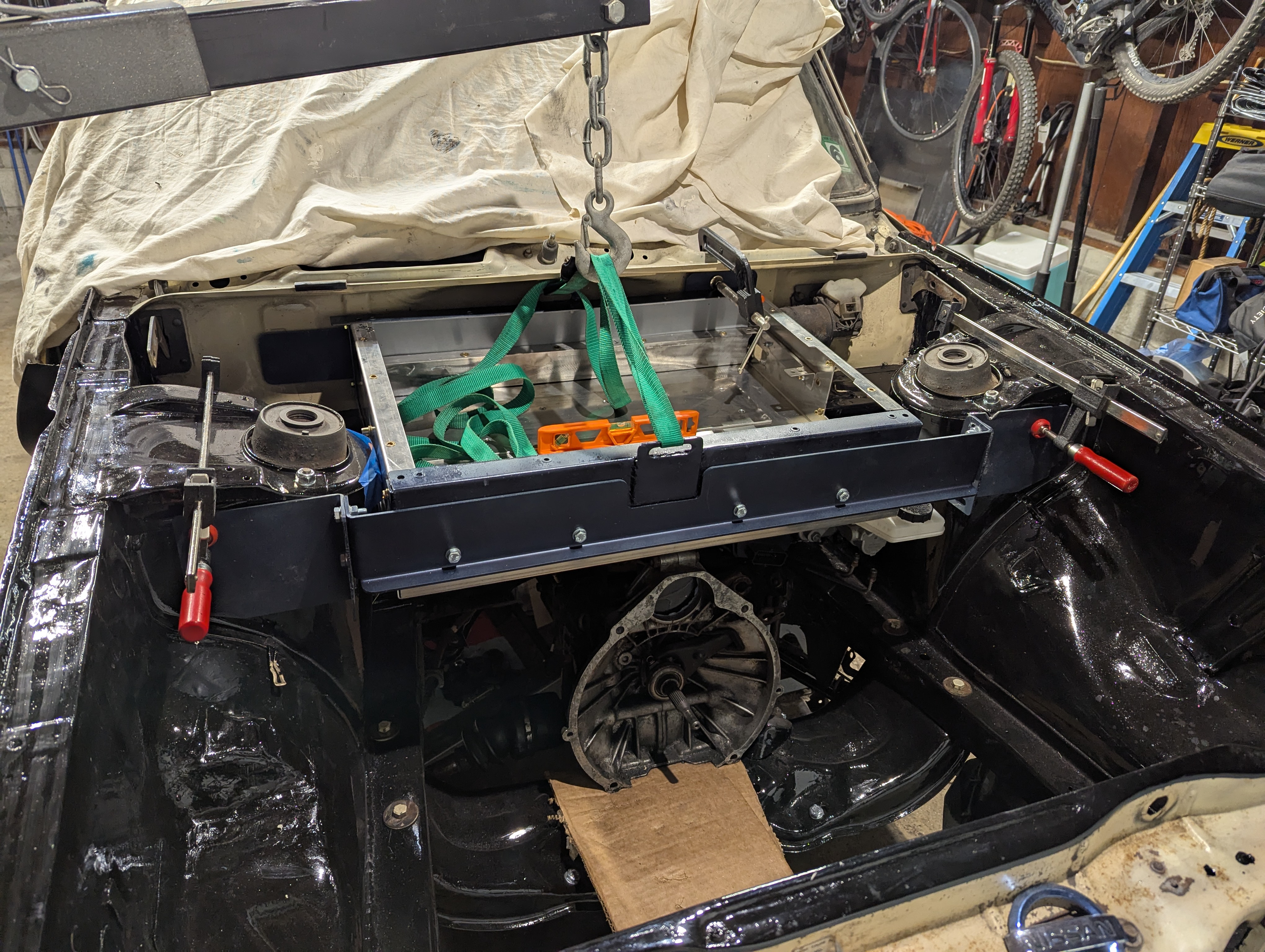 everything in the engine bay and transmission tunnel that's gonna get hidden by the new components has been ground, cleaned, sanded, cleaned, filled, sanded, cleaned, rust convertered, primed, filled, sanded, cleaned, primed, over and over again! order of operations was a little off haha. new fasteners are showing up so i have started mounting things back on and MAN does it feel good to put things together instead of take stuff off. i have steering knuckles and brakes from a newer generation subaru en route, 1st of 4 battery boxes waiting to be made at work, planning to assemble the motor coupler this week. i rearranged the battery layout for the rear packs. instead of 2 4-packs under the rear seats which would have involved cutting a huge section of the floor out and remaking it, i realized i actually can fit more batteries under the trunk that i first thought. so new plan is to make a 2x2 saddle pack under the seats and 2 separate 4-packs under the trunk. this part of the project is frustrating, i'm putting tons of planning and buying in with very little tangible progress. but it feels like it will come together fairly quickly once i get past whatever tipping point!