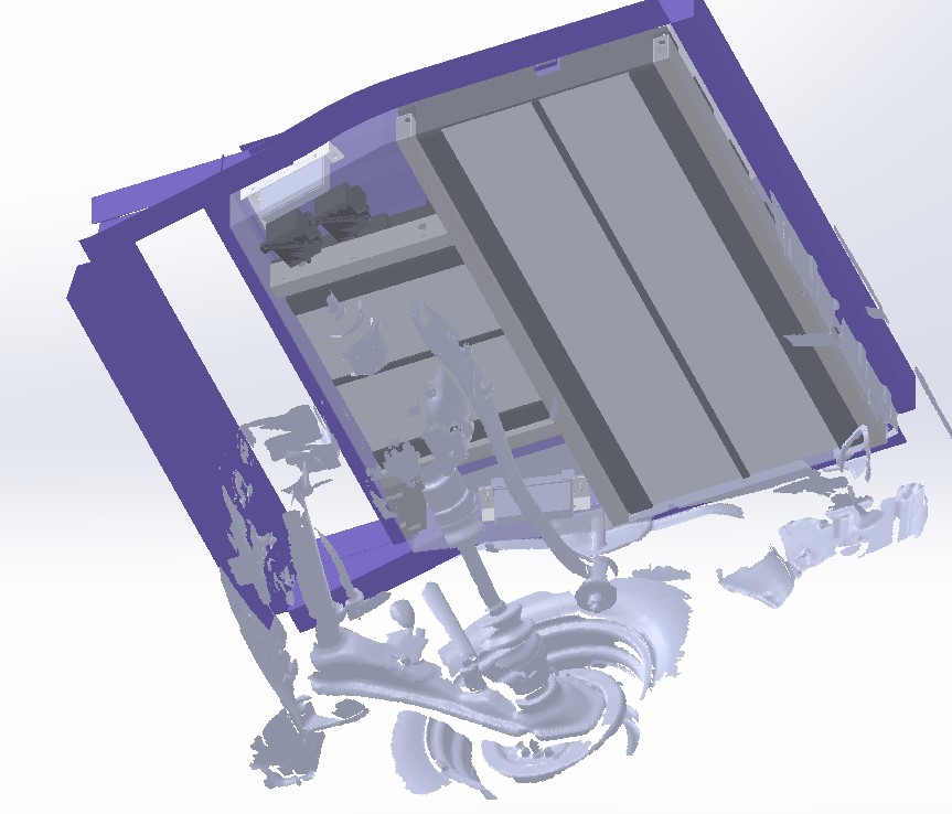 I couldn't get the PDM to fit in CAD so i went and tried to fit it in the drivers side front corner in real life and it didn't fit. So i chopped off some random little brackets and it kinda fit, but not with the giant radiator in. Next to do: see if i can get back with like a half size radiator for cooling a 2013 leaf stack with the 80kw inverter. Then going to consider rotating the motor and inverter about the transmission center to make more room for the PDM. That's what's shown below, and the most promising orientation for the PDM is fully upside down. After viewing Johannes' teardown and noticing the cooling channels are all planar i'm not concerned about air bubbles or anything regarding orientation of the PDM. It also looks like both the bottom and top covers of the PDM are oversized and maybe i'll consider making smaller custom covers for the PDM to do a honey-i-shrunk-the-PDM!