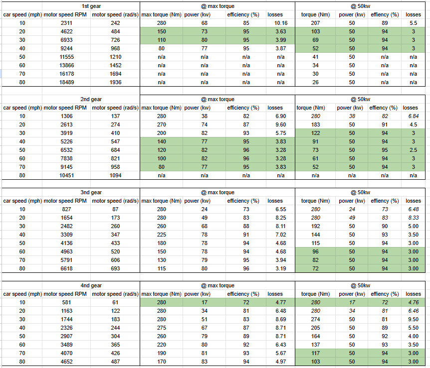 Motor speed, power, efficiency and losses are shown at max power (80kw) in one column and at 50kw in another column. 50 kw is a random guess at the most continuous power i would need. the stock radiator in the subi is a similar size as that of the leaf, and i would like to get a slightly smaller one so i can push it closer to the grille and make more working room in the engine bay. 10kw cooling power on a hot summer day will be my lower limit. time to learn about radiators!