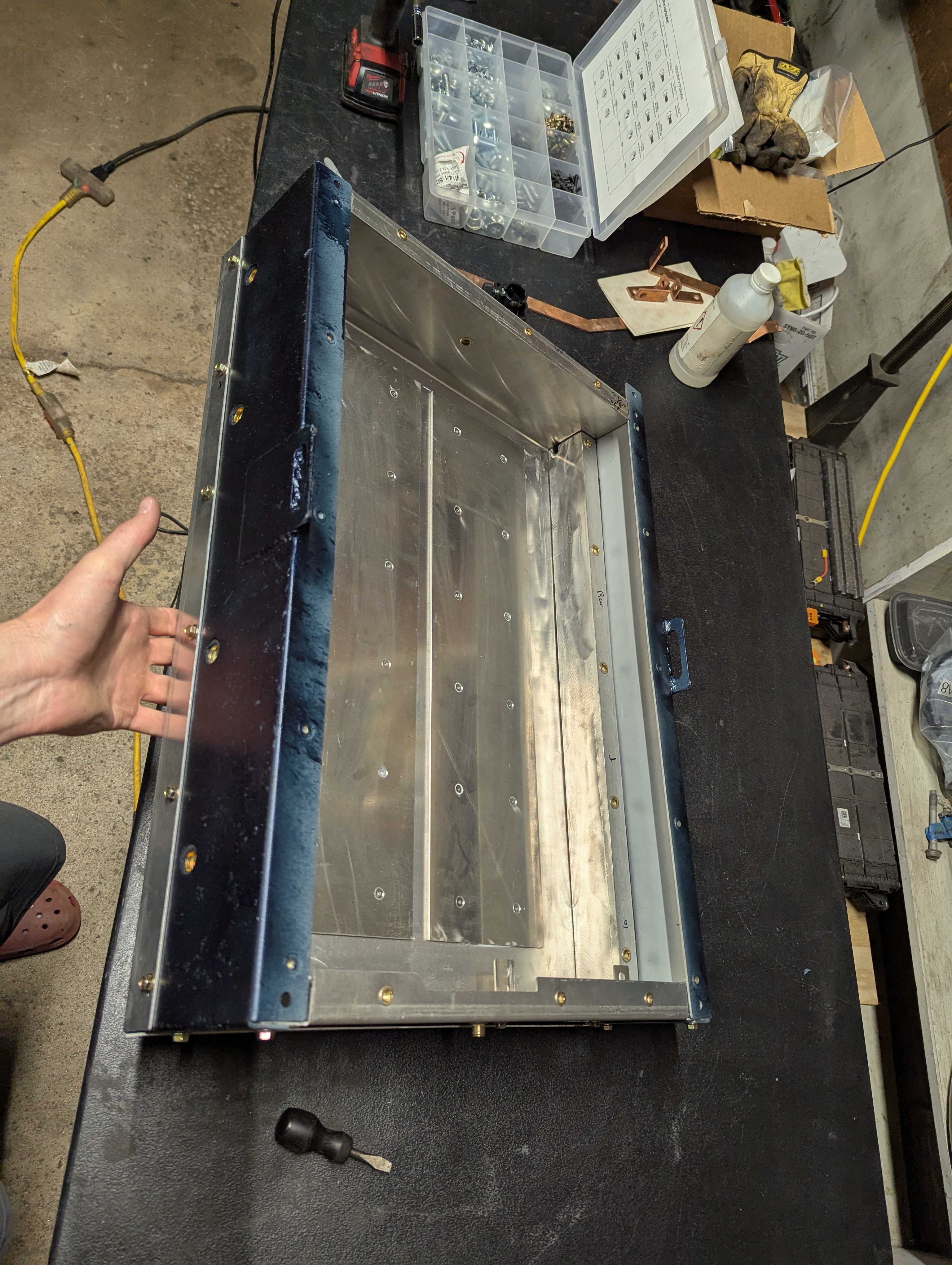 The enclosure fit into the car just right and got the mounts match drilled. Then i had to do a handful of small but time consuming reworks (slotify some holes, move a riv nut, paint, add gaskets, etc.) The big picture design looks good still and i think everything is going to fit!