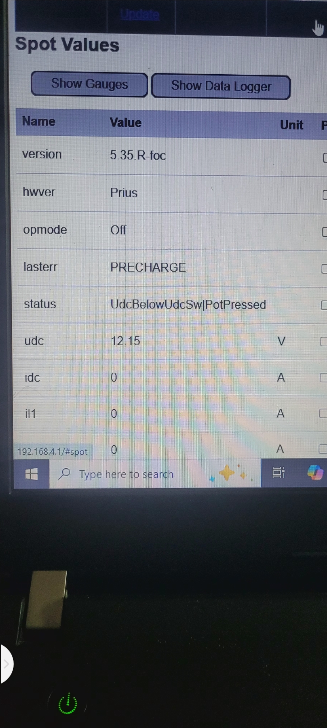 When I had the throttle connected STATUS on spot values first showed "PotPressed" and on another test it said "UdcBelowUdcSw|PotPressed" .