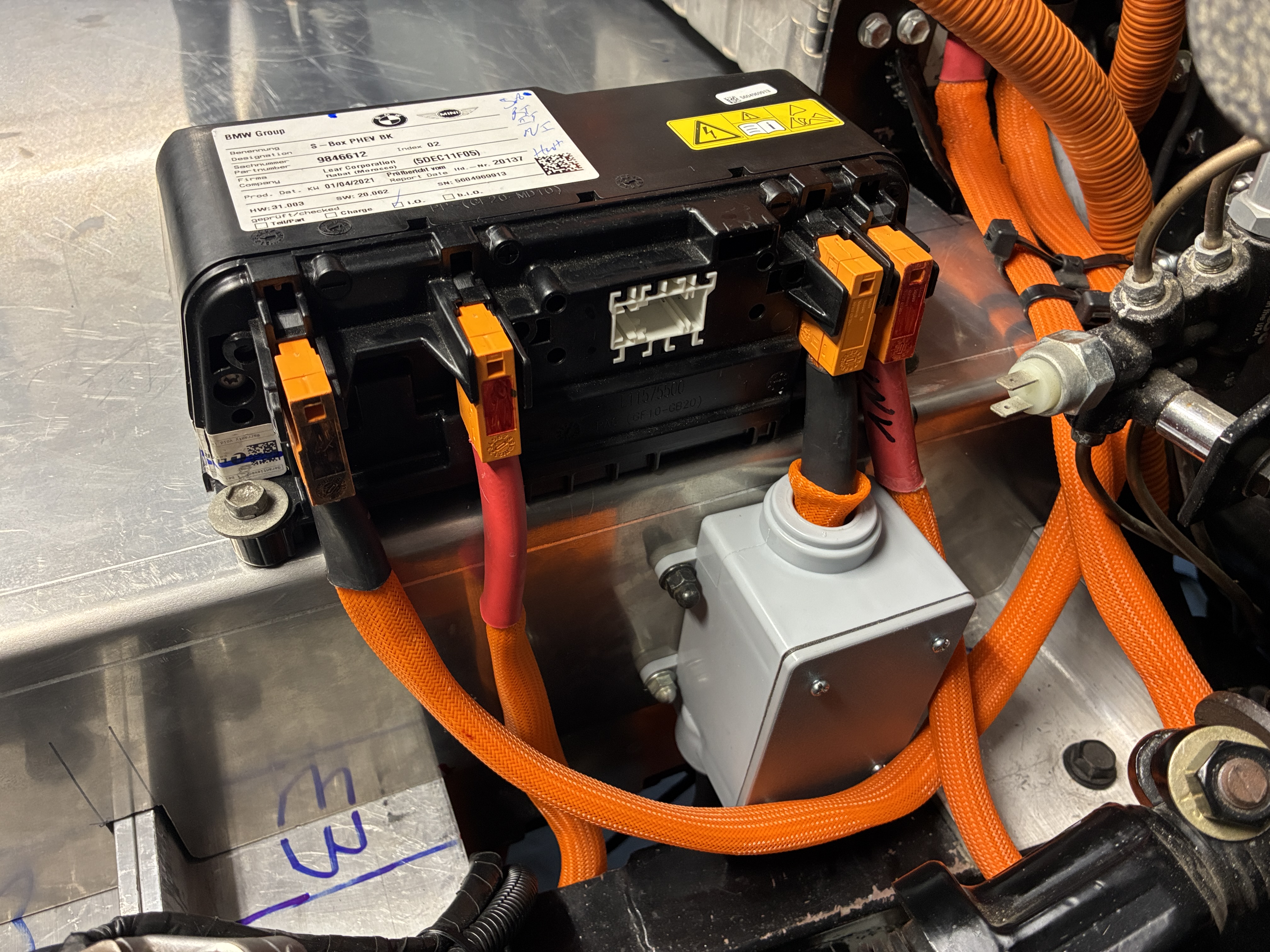 so then it was time to tether this sexy CANTEX junction box to the BMW sBox, so first we do the DC-DC converter leads, these are properly wired to the output of the box, meaning both contactors need to be closed for current to make it's way to the junction box