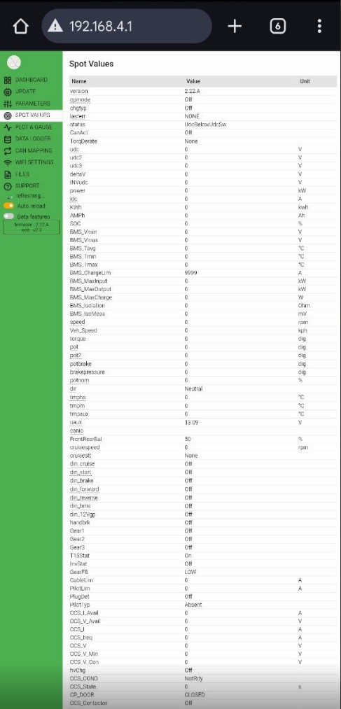 Good afternoon. Please help me set the parameters correctly. I soldered both CAN bus chips. So far I am using only pins 27 and 28 for the CAN bus. If I go to the "SPOT VALUES" menu, I can see how the din_start, din_brake, din_forward and other parameters change. But how do I understand that there is a connection between the PDM and the inverter and Zomvieverter? How can I see if they are exchanging data with each other?