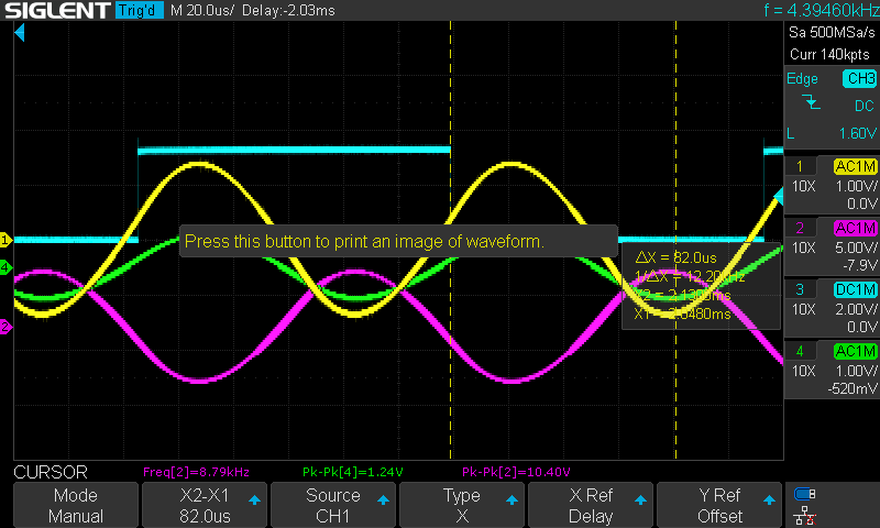 The sample is actually scheduled from the trailing edge of the cyan trace. This measures as 82 uSec. Which is a shift from the 40 uSec used at 4.4kHz. I hope there is enough time for the injected conversion to complete before the resolver code reads the value on the rising edge of the cyan trace.