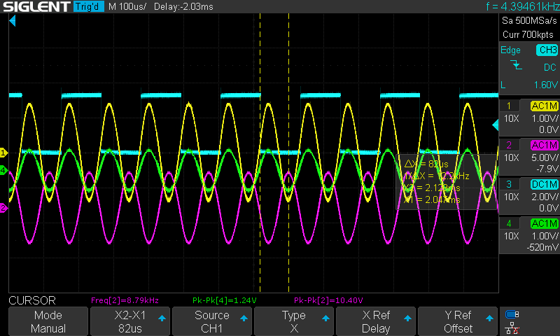 Cyan is main control loop with the dotted line being the sample delay. Yellow is the sine and green the cosine signals with purple being the exciter.