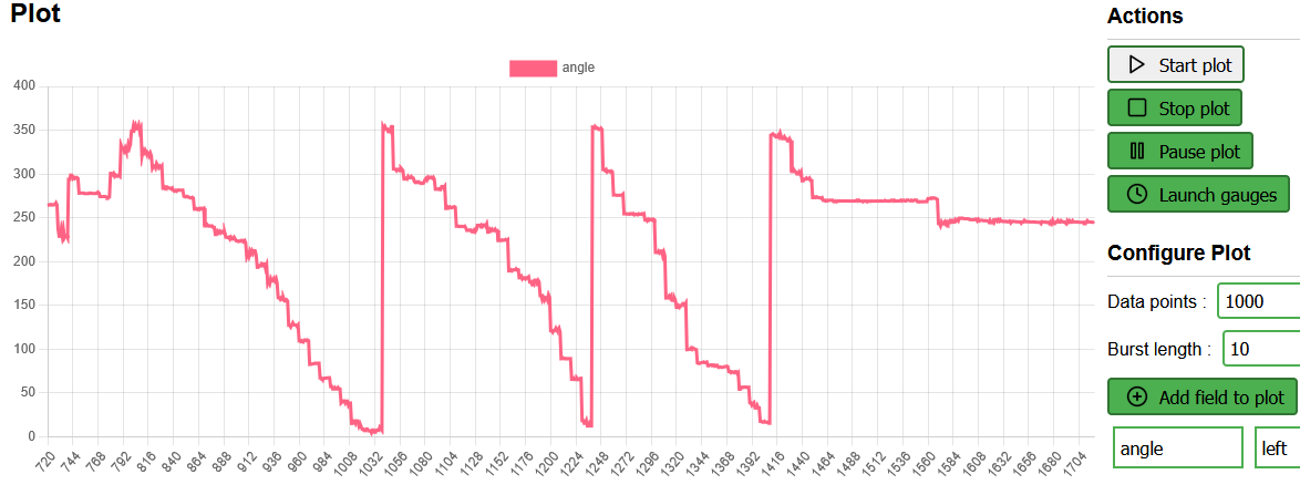Fix that and I stop getting garbage data. Here's a plot of the angle as I walk an uncalibrated nut round the resolver ring then hold it steady:
