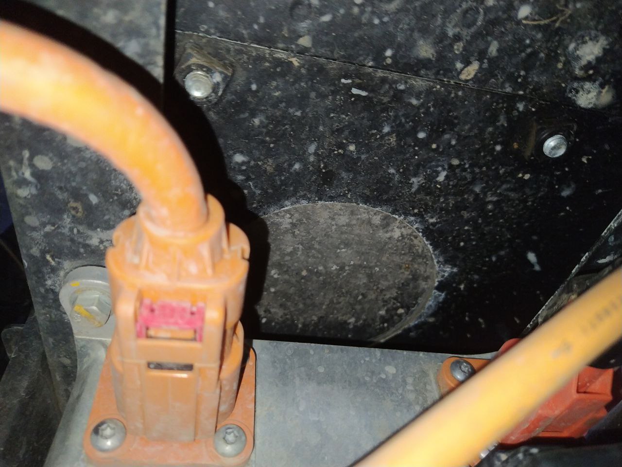 In the spirit of getting the car going for now, I managed to disconnect the connector in the middle of the INVCON 3.3 Inverter that was originally intended for an AC compressor. The full inscription is "TE 1587819 17237 2103149-17258". The trick for getting it off was to remove the gray cap first (sadly, I couldn't take pictures, because my phone was empty). That was quite hard to do and I still mangled it somewhat. I finally managed to remove it by sliding in one end of a pair of bent snap ring pliers under the plastic clip on the bottom. Afterwards, the plug could be removed by pressing down the orange tab, pulling the plug out a few millimeters and then pressing the red tab in and sliding the plug out completely. Amazingly, it does seem to be a straight (fused) connection to the big DC terminals, at least the voltage came up immediately, as the main contactors closed. The plug does have an HVIL bridge, but I overcame my constant fear of bricking something and having to go to that expensive workshop and tried without the HVIL jumper and it still worked! I'm pretty hopeful that I will be able to use that connector to charge, at least temporarily. That misuse of the AC compressor HV connector for charging is what most (all?) VAG cars with that inverter seem to do, which I find quite funny.