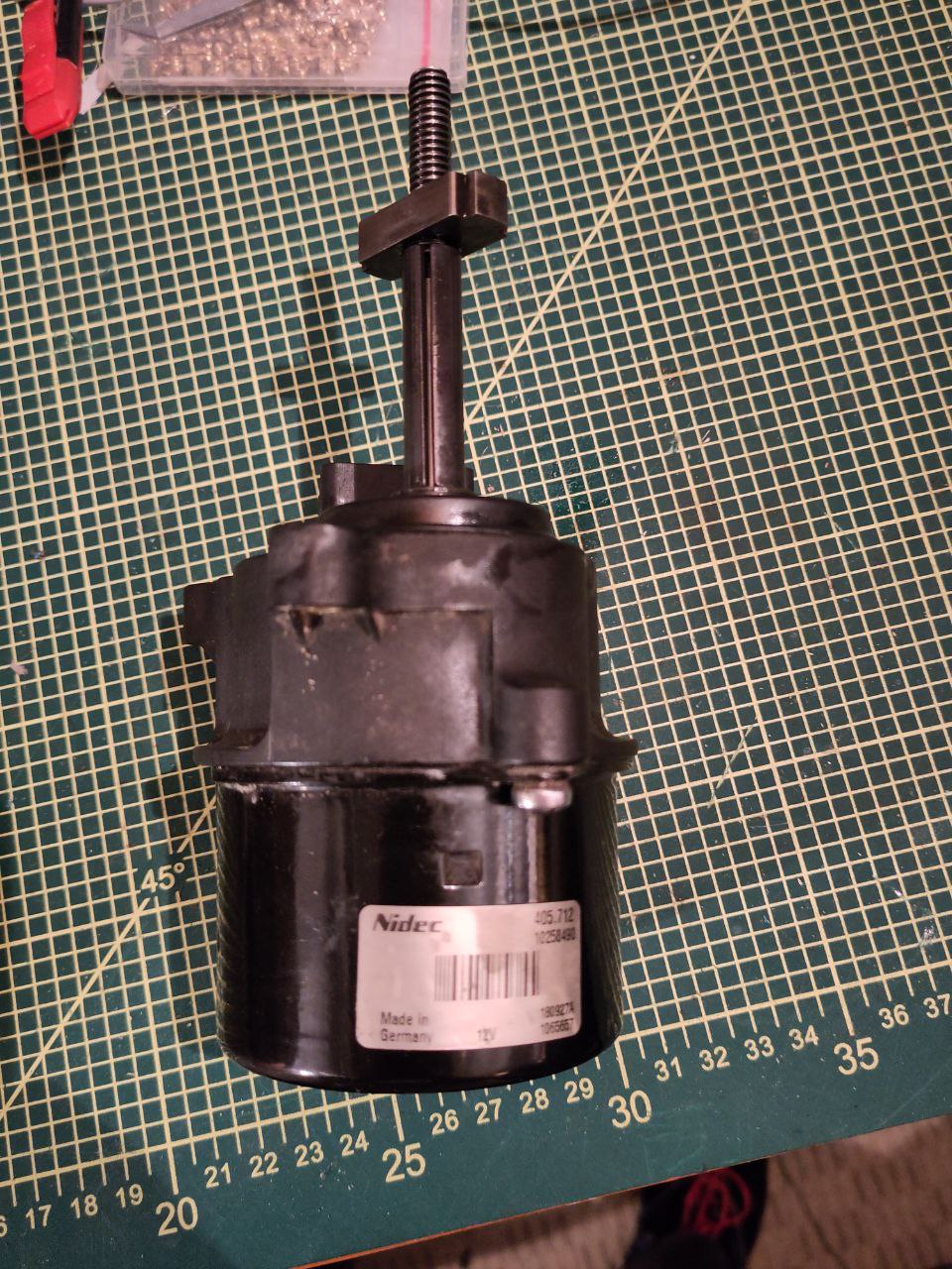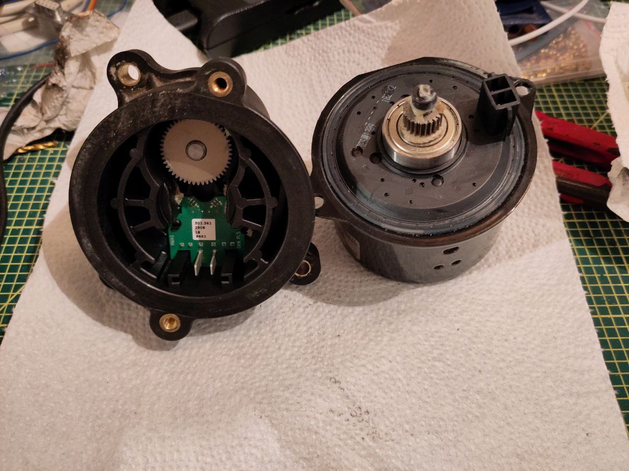 On the inside, it looks exactly like the description in the Fiat repair manual. A beefy DC motor drives a threaded rod with a weirdly sphaped nut on it over a 2-to-1 reduction gear. On the end of the motor is a magnet, that is used by two hall effect(?) sensors to register motor rotation.