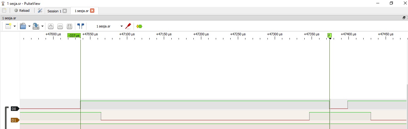 Meanwhile here's another log by different kind of a crappy dongle captured by PulseView. 2 sessions differing by trigger up/down hence the missing first 1.6us high state part in "sesja 2" file. Starting sequence makes me thing again that logic 2 knockoff dongle is trash. This parts highlits glitching in logic 2 too.