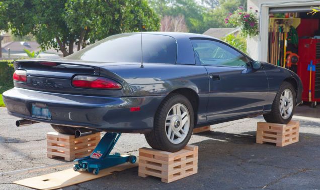 10. lower the rear axle on the wooden stands and remove the tire lifts