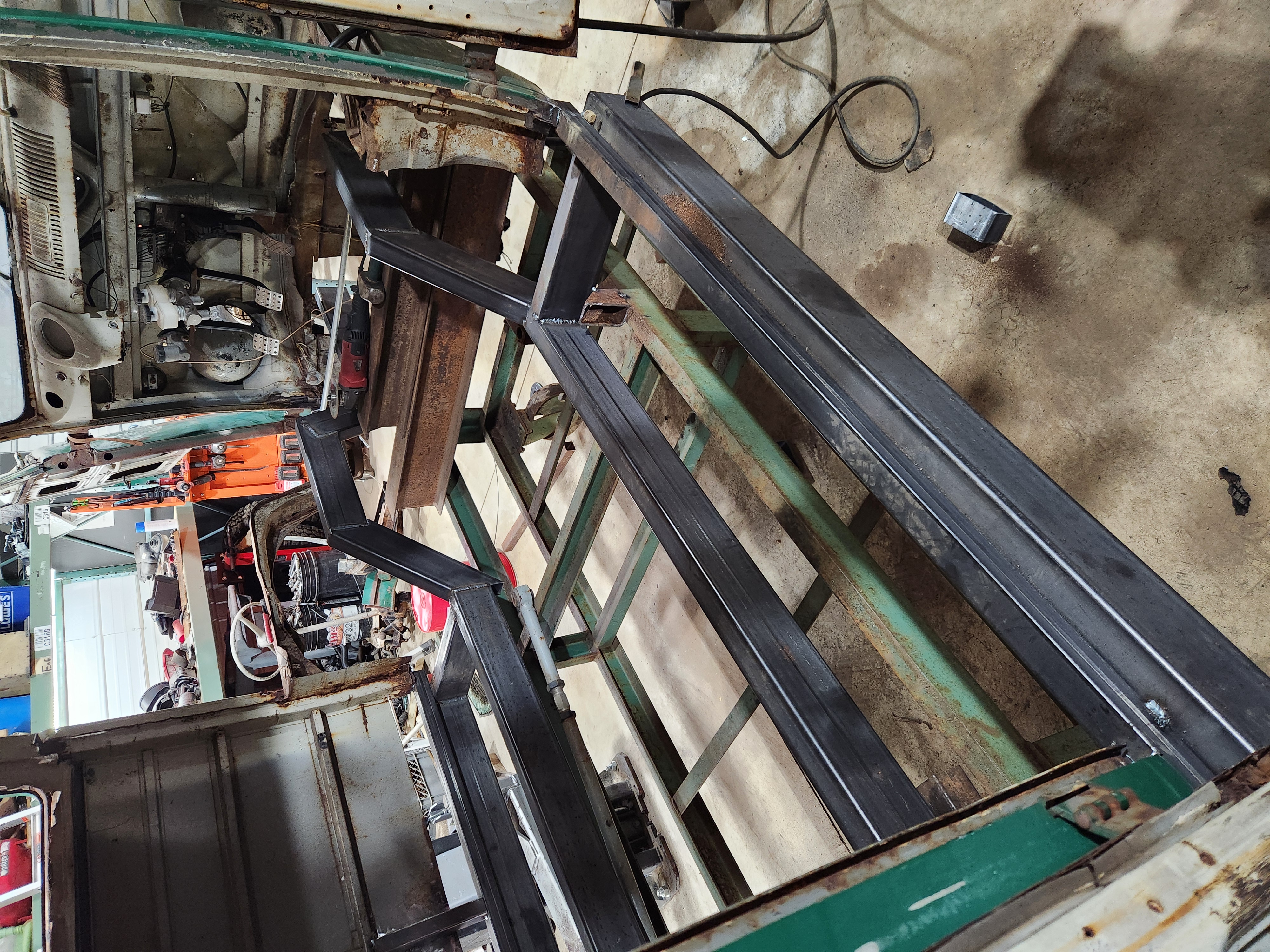 The sideways bus with the toy axle mocked up when it will still going to be diesel powered The chassis under it. And for good measure, another one of my VW's doing some yardwork yesterday.