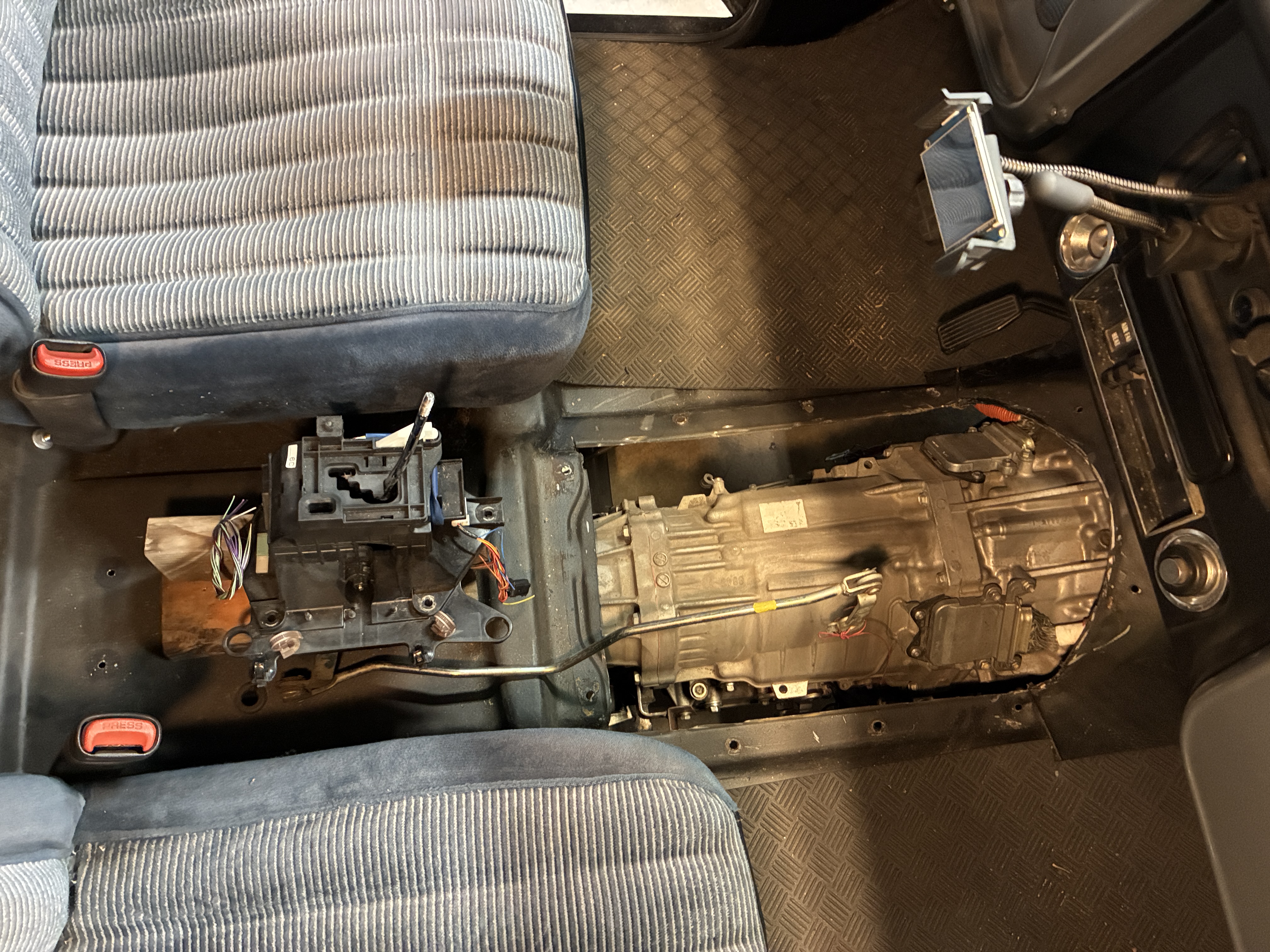 it's a crude setup but it demonstrates how far back the actual floor shifter sits behind the transmission, fine in a car, not so fine in a truck, or is it?