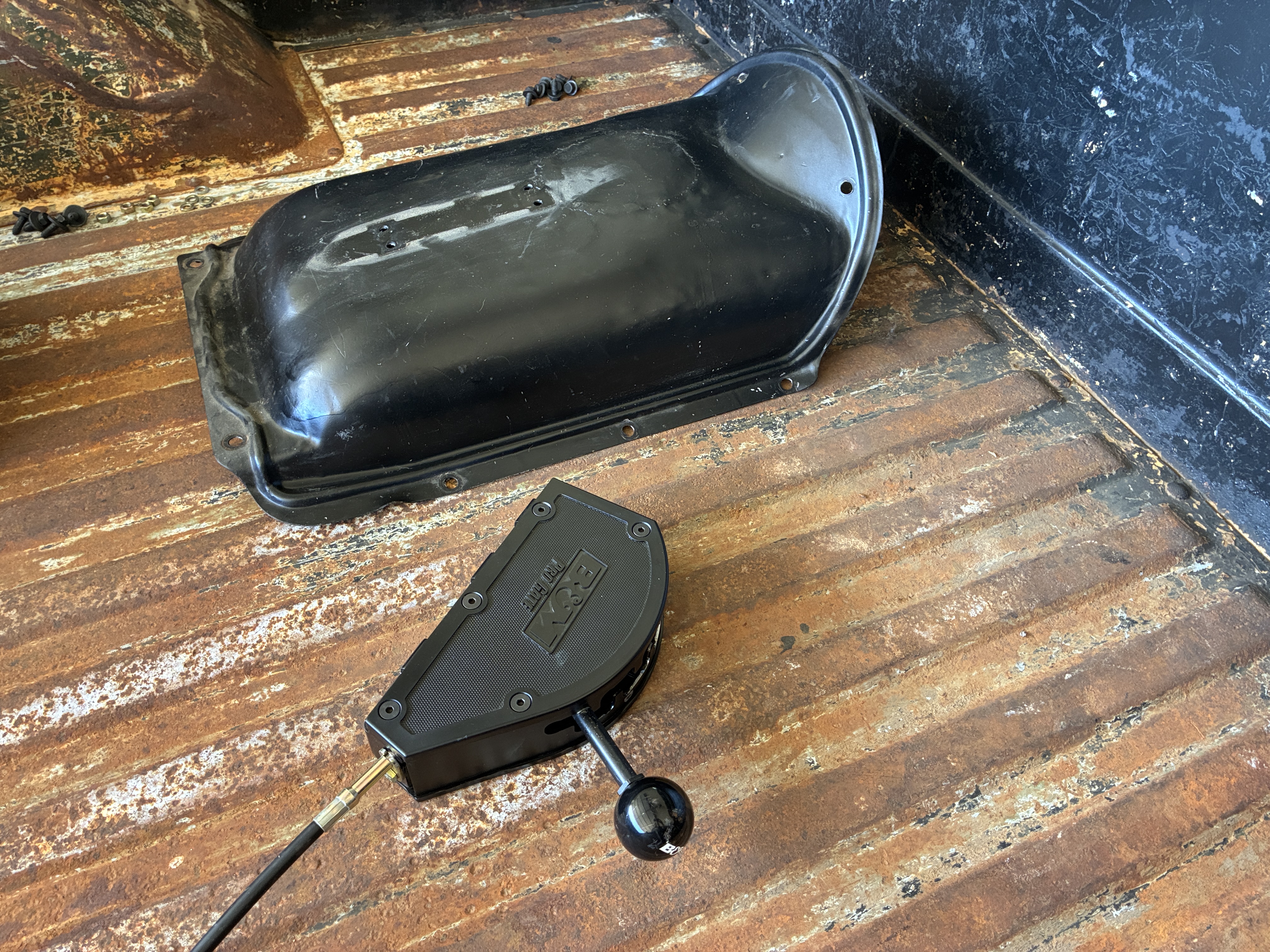 so a bit of quick thinking later and we swapped the shifter gator boot off the 4WD shifter cover for the greasy blank plate tray thingie from the 2WD, and yes it will bug me to have a baige insert, but I won't tell if you won't tell