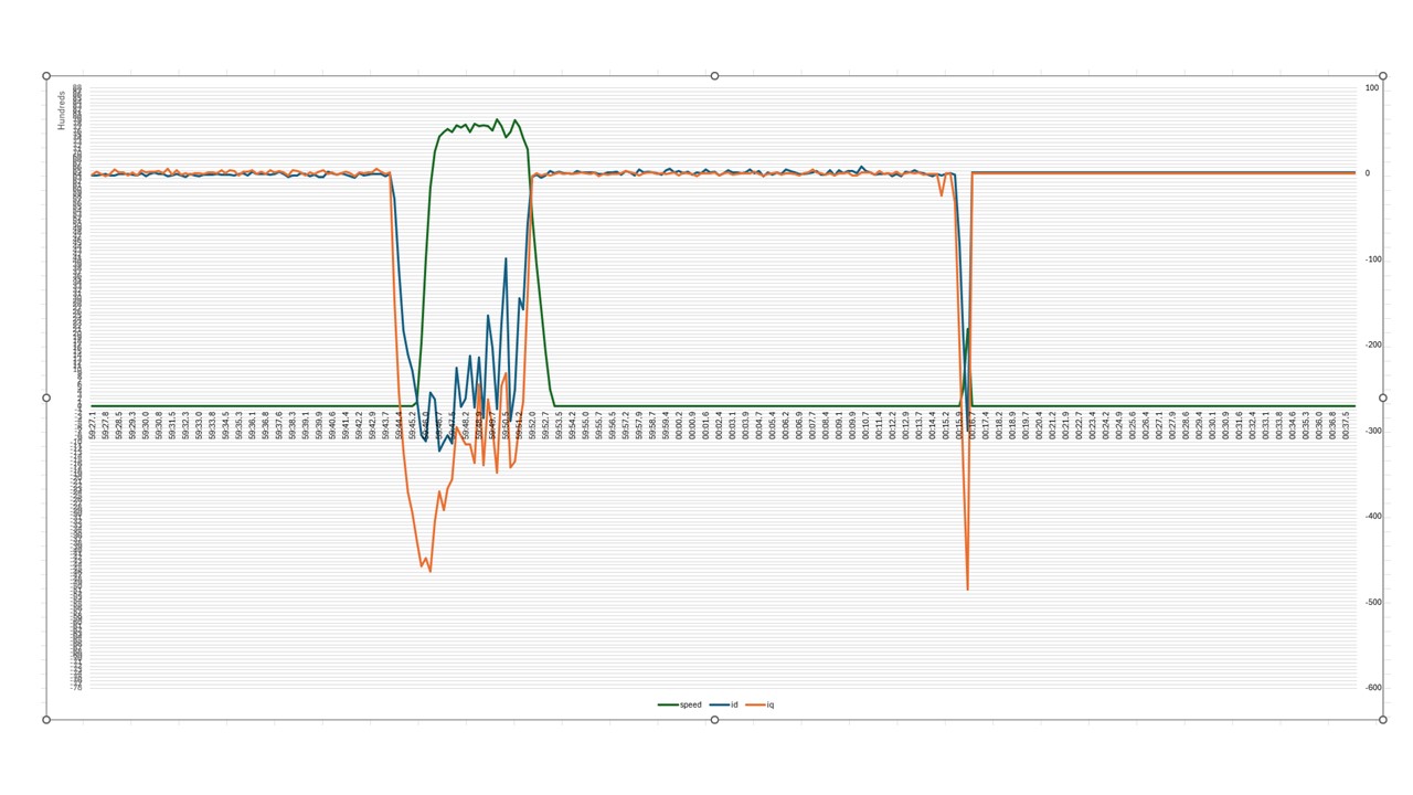 I noticed the motor isn't spinning very fast, but I think it's at its maximum speed with the 50 volts I'm using. About 1060 rpm, if I'm not mistaken. When I switched the power supply to 60 volts, it started spinning a bit faster. I heard from Demain in the video or read here that the field weakening isn't turned on, which could also be the reason the engine doesn't run any faster. Perhaps that's just a matter of tuning?