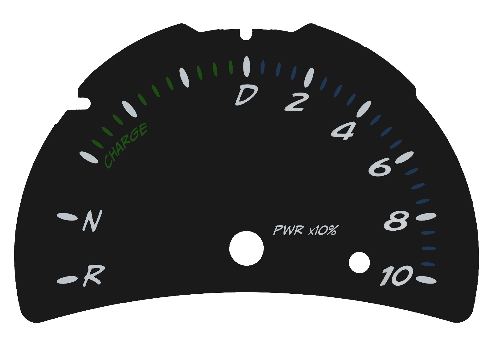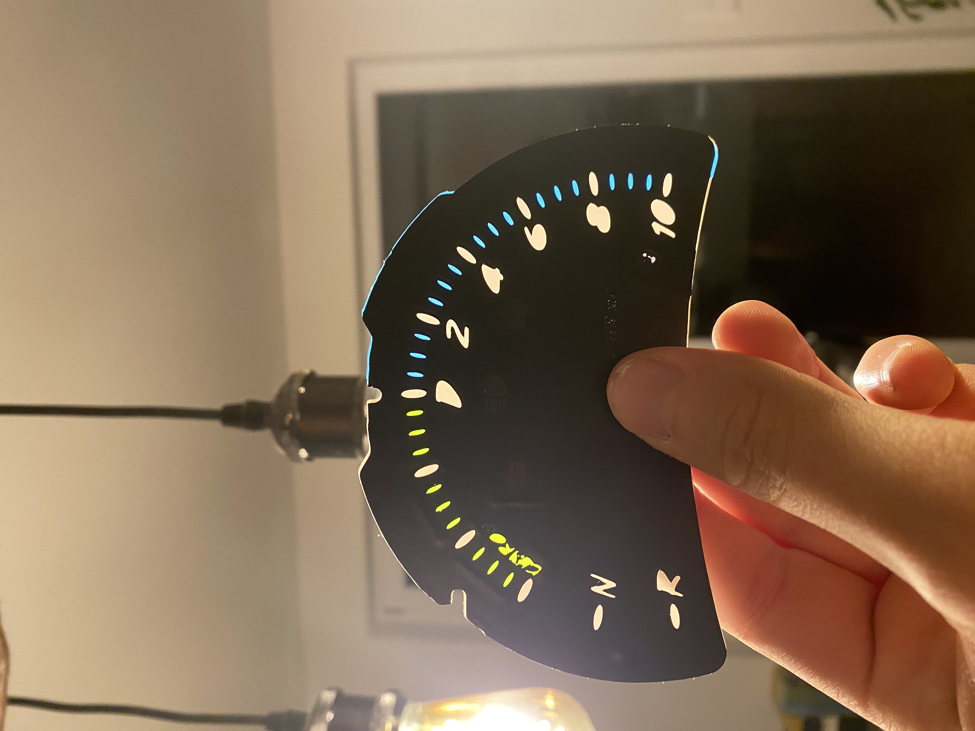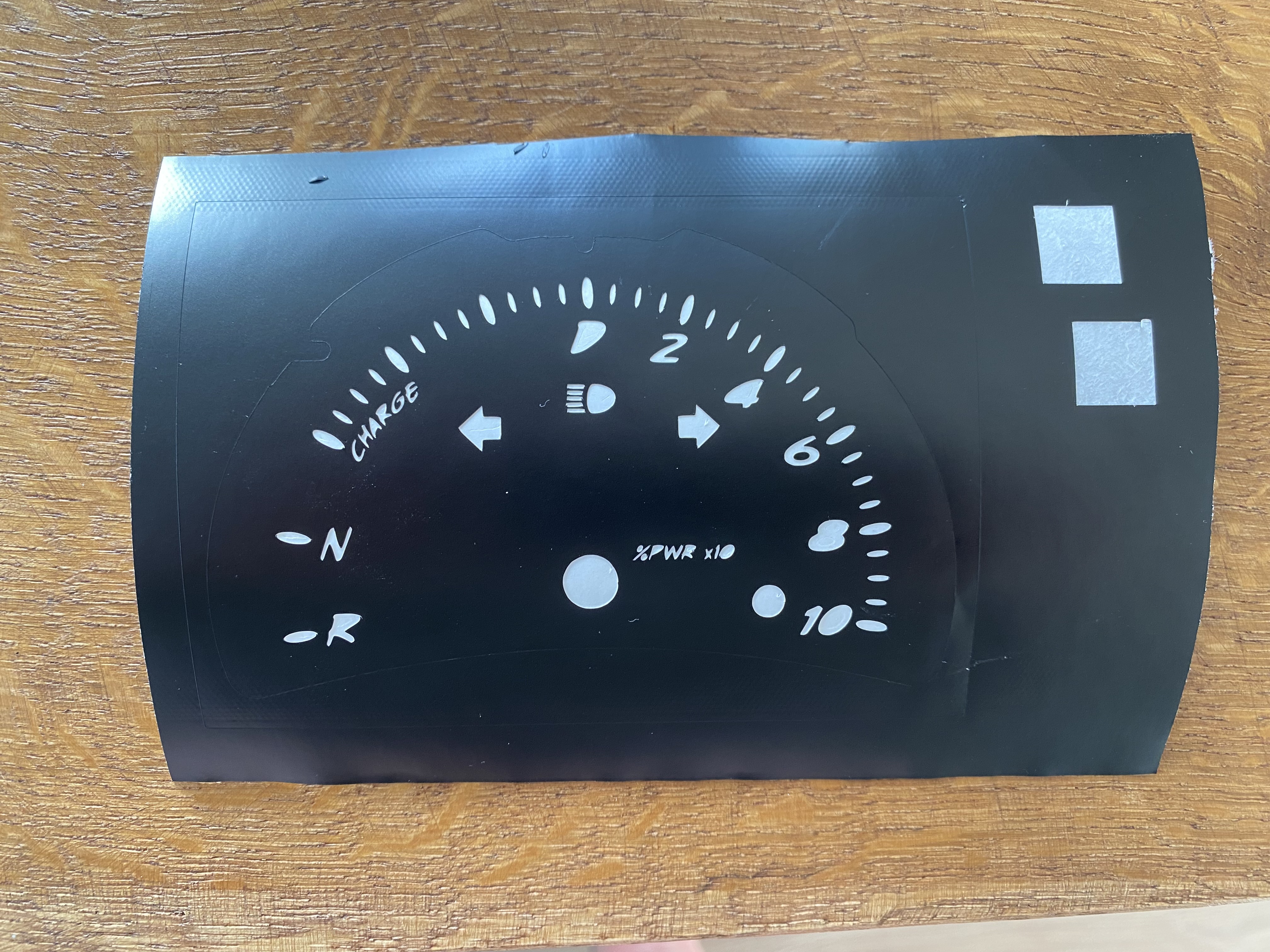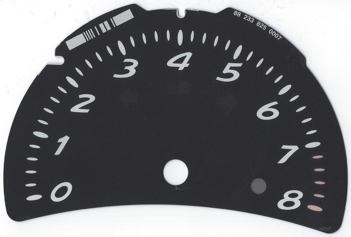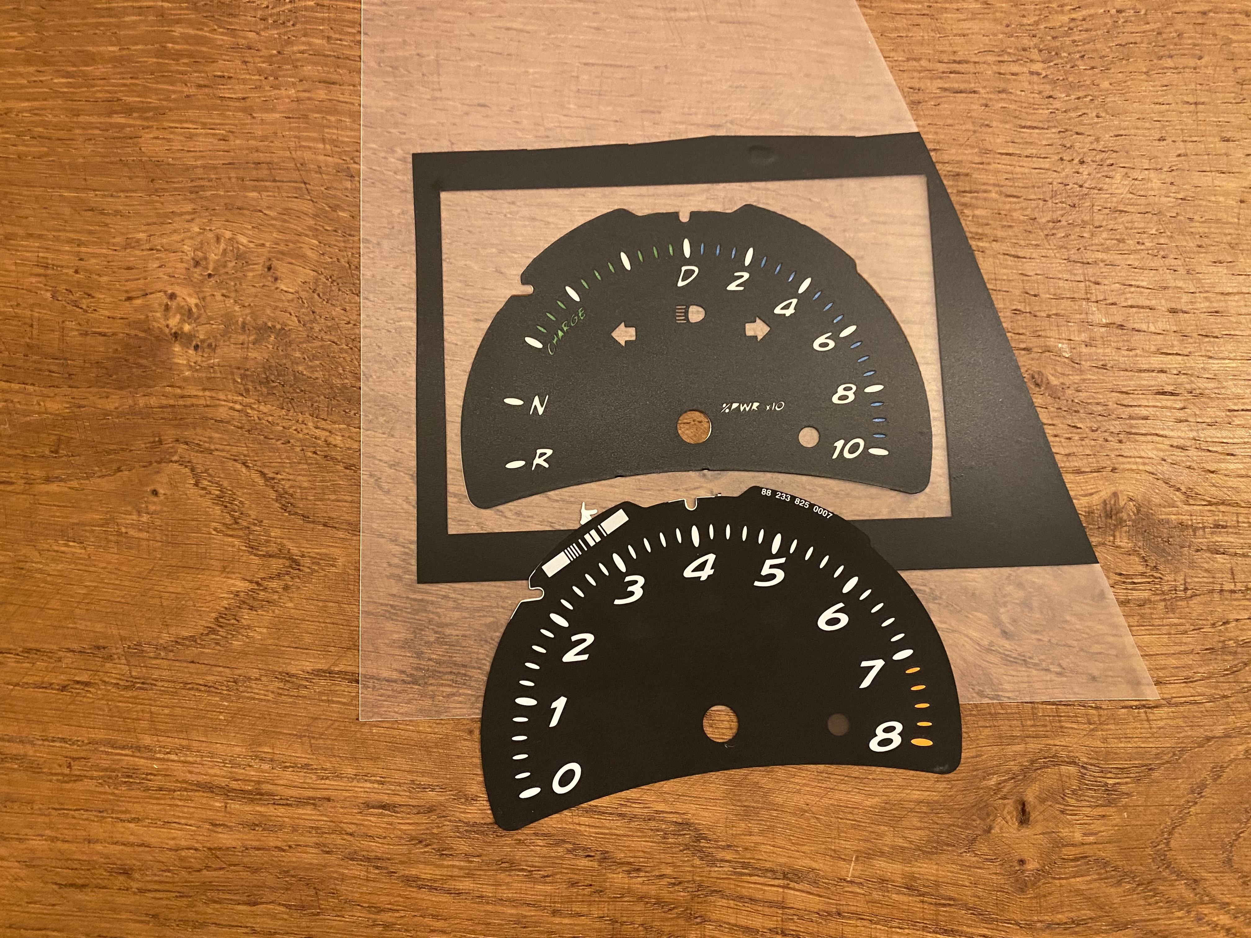 First I scanned the original cluster disc for the RPM. Then I had a friend design me in Photoshop a modified one. I cut a 0.3 mm frosted acrylic glas on a laser cutter to the exact dimensions. Then on a vinyl cutter I cut out two layers of vinyl. Upper layer on one side of the acrylic glas is Blockout Vinyl for light advertisement in black. This was basically two steps - the normal cut out and then the missing little pieces for the middle of the „0“ and „D“. On the other side of the acrylic glas translucent vinyl in green, blue and white. The translucent black one wasn’t really translucent at all. So I took overhead projector plastic and printed different test patterns in different tones of gray to fill the symbols for signal lights and high rpm. At the end I put several layers of matt clear paint on the front to fix especially the very small parts for hotter temperatures.