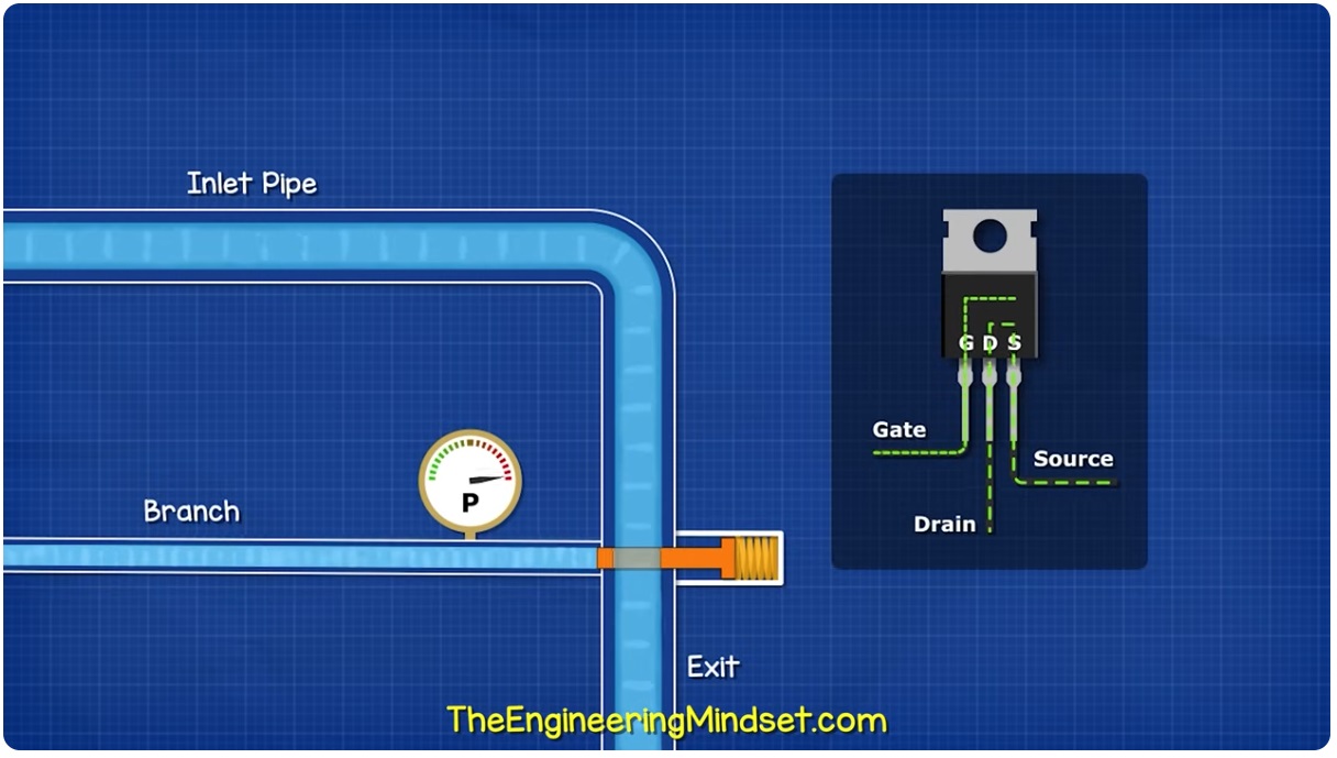 small pressure or voltage applied to the Gate pin on the MOSFET, not enough to open the valve