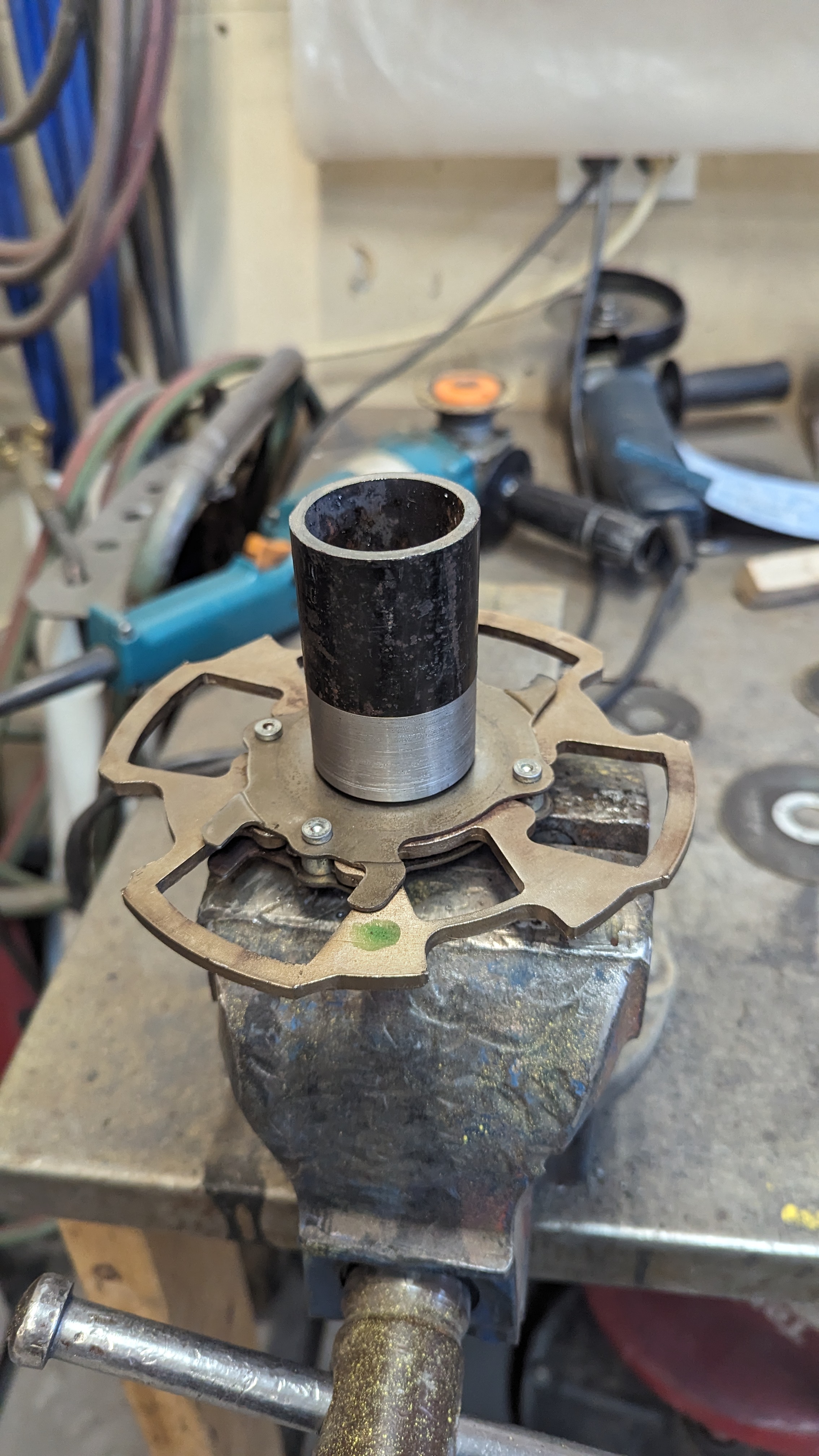 The spline center is turned down from the center section of the standard GS450H flex disc and the spacer is off the shelf mechanical tube. I welded these together, but others have made bolted versions using the same centre spline section without removing the four legs! Check out Greg's 450H videos for some good references