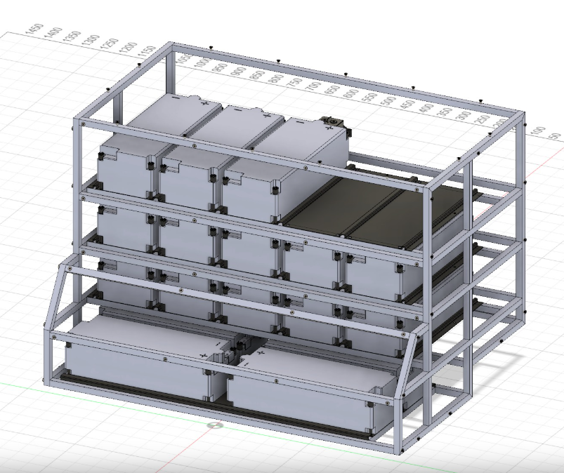 According to my measurements 8 ID.3 modules in a 2 × 4 stack would be about 59 × 46 × 48 cm and should fit into the box that has available room without the weird shaped lower part of 95 × 48 × 48 cm