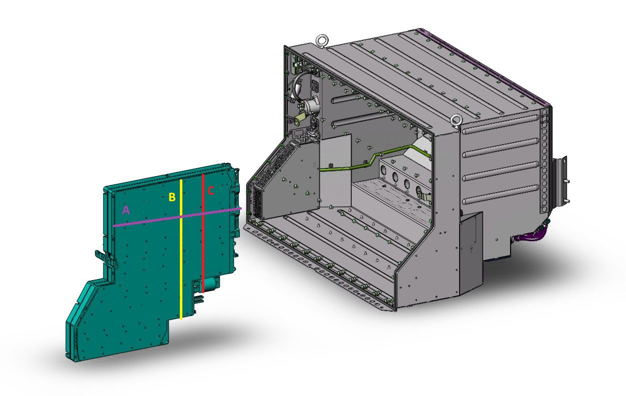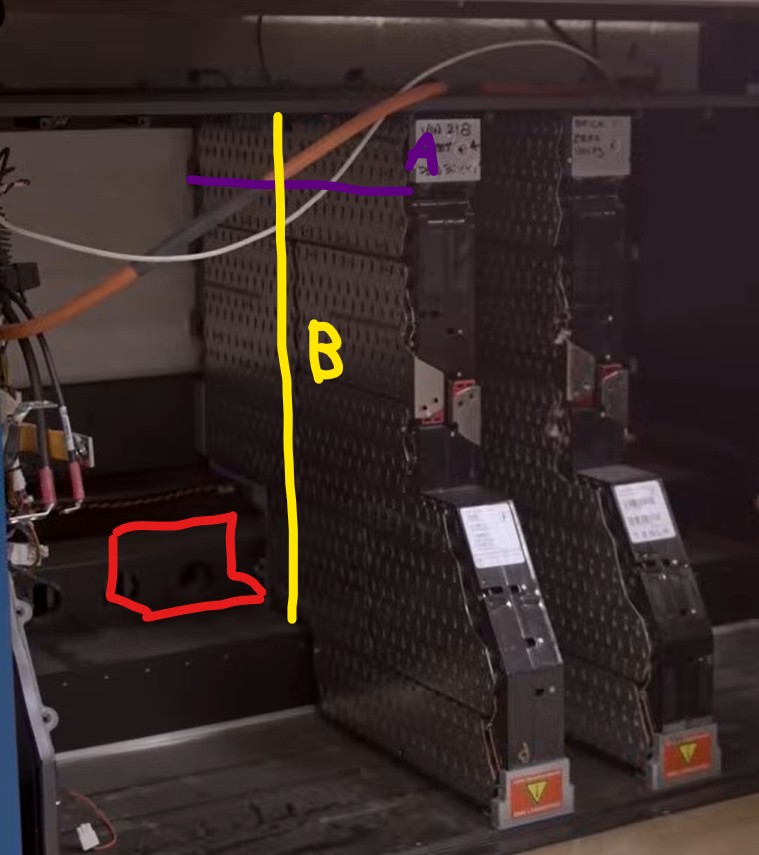 This confirms that the ID.3 modules are a really nice fit for the Roadster battery box — but i will have to modify the box slightly where the original 11 cooling pipes exited the box. See red marked area, of course over the whole width of the box.