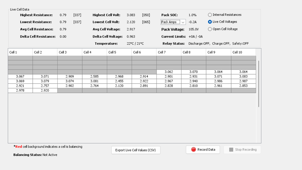 I pulled out the cell taps from the ORION 2 and inserted them one at a time to take readings. Here is what I got. Unfortunately, I started popping fuses like popcorn when I got to the last one so I shut it all down and emailed Andrew Ewert again. Oh well . . .