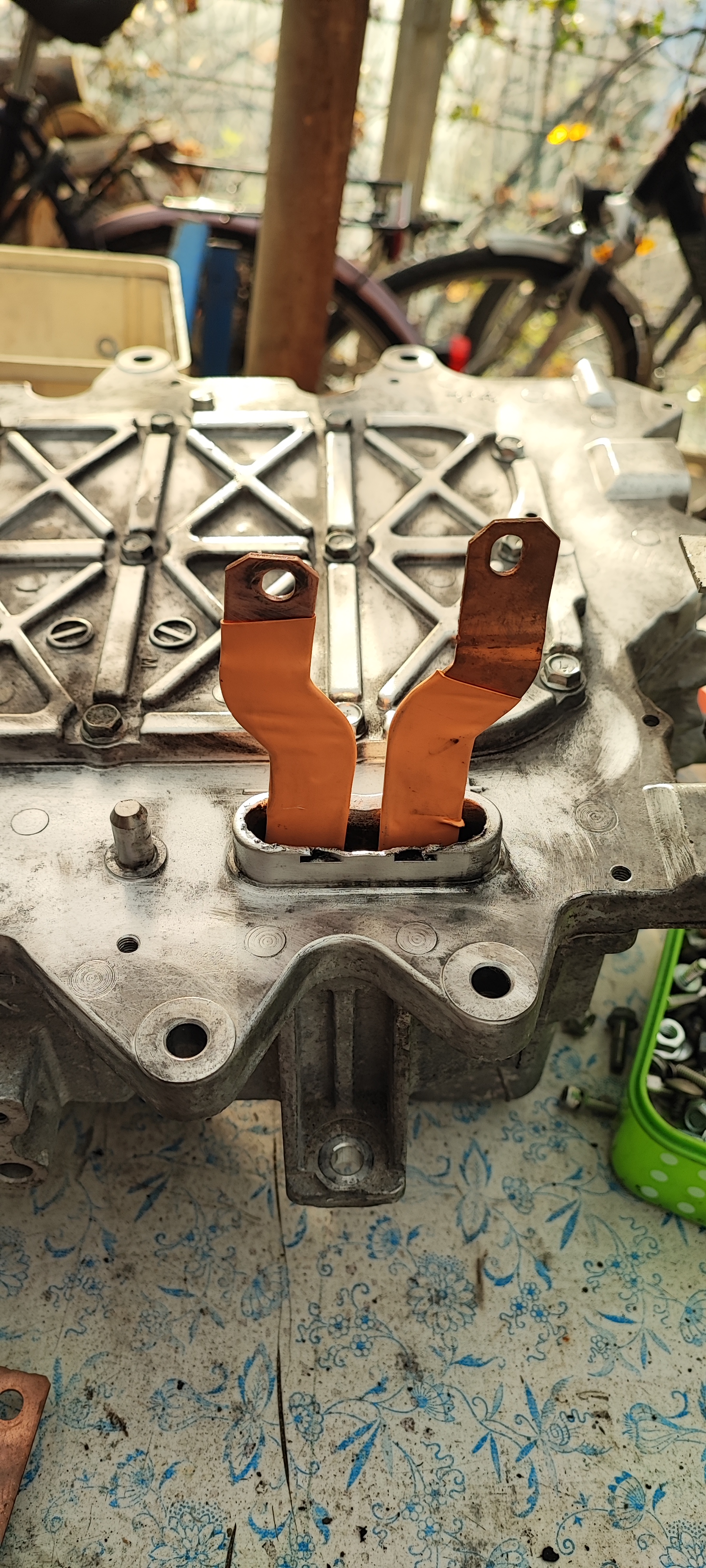 To the right is the new contactor box with positive contactor still missing. Finally got to use the VW battery bus bars