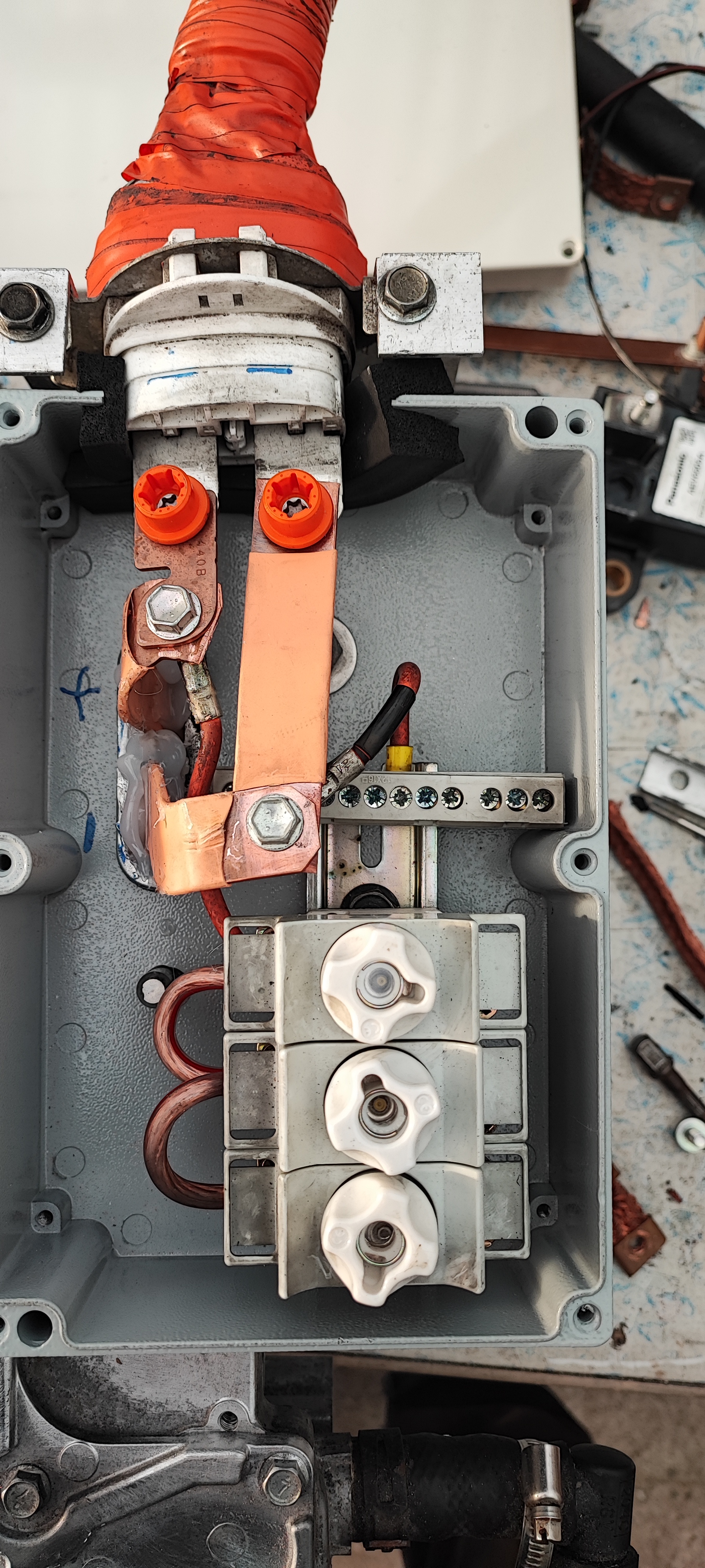 Test fitted fuses for heater and charger and one spare. Not sure if solid bus bars are the way to go since the cable will vibrate and move on load changes. Thinking about putting a 3D-printed part to better seal cable entry