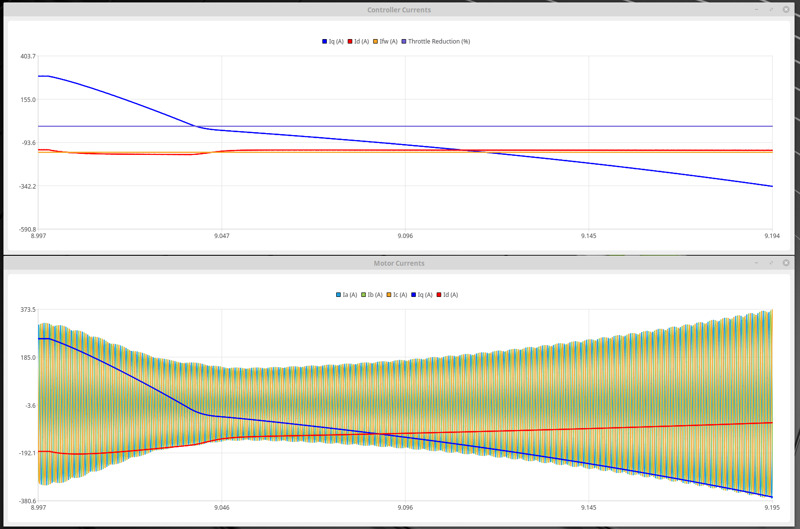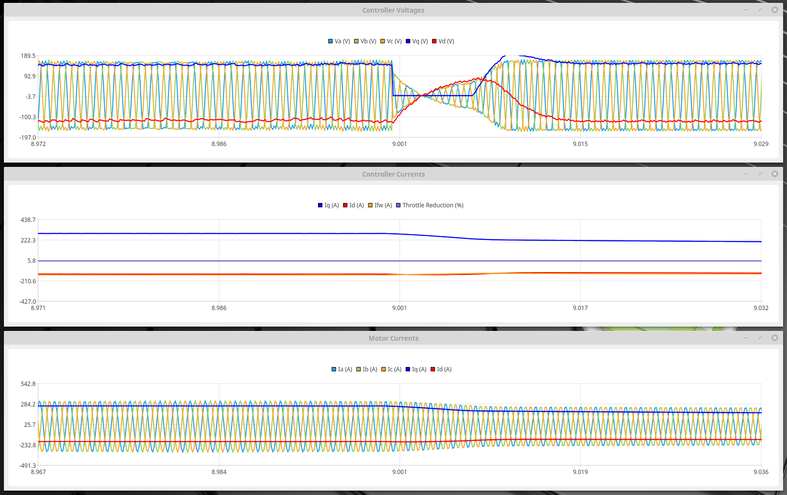 You can see in the controller voltages where it it cuts the Iq in response to the throttle cut. It also seems to reduce the -Id which doesn't quite make sense. These seem to recover pretty quickly but it's already too late and they have caused a slight drop in -Id and the loops never recover. Motor currents peak at around 2000A but the controller only sees around half this.