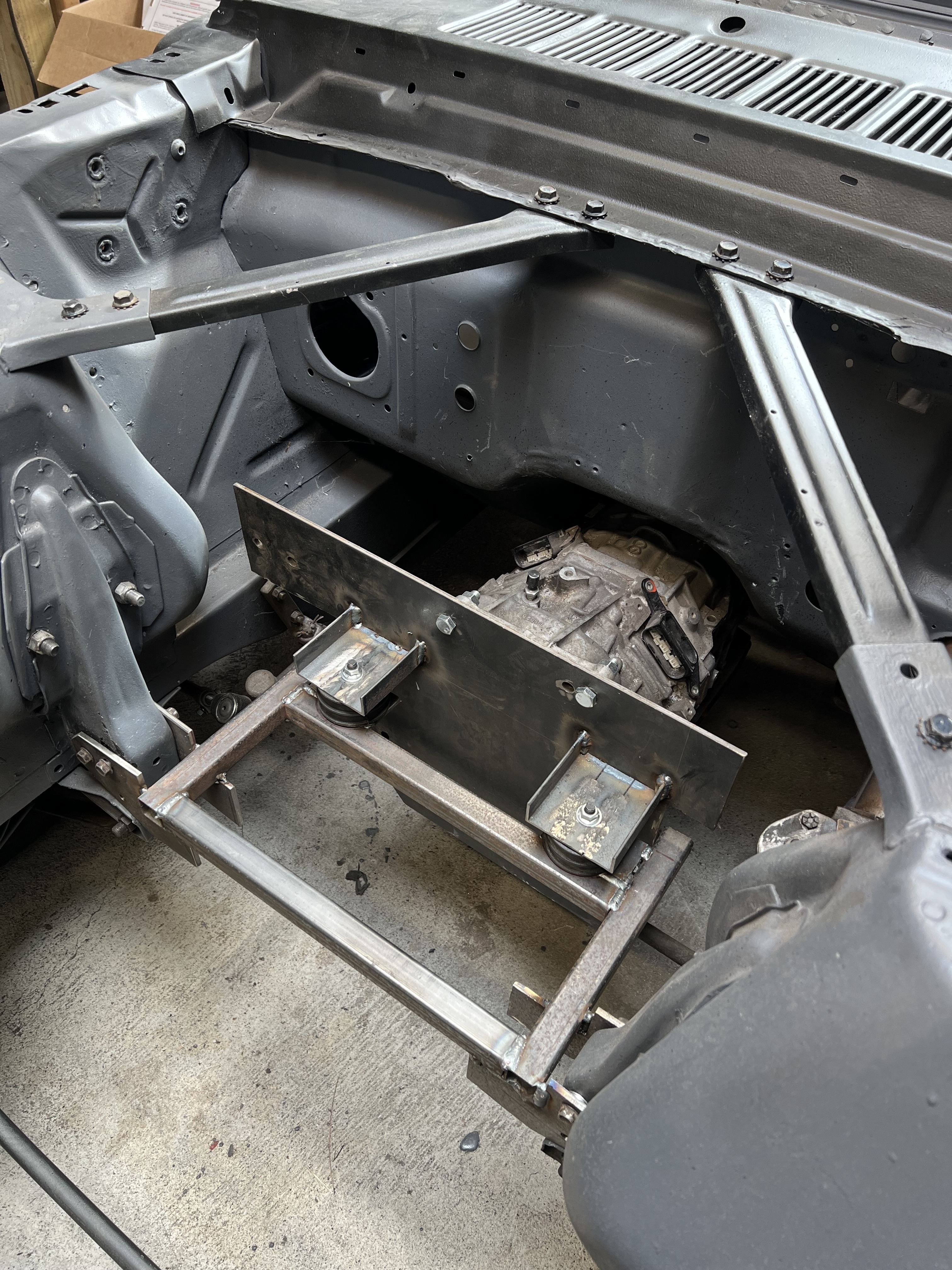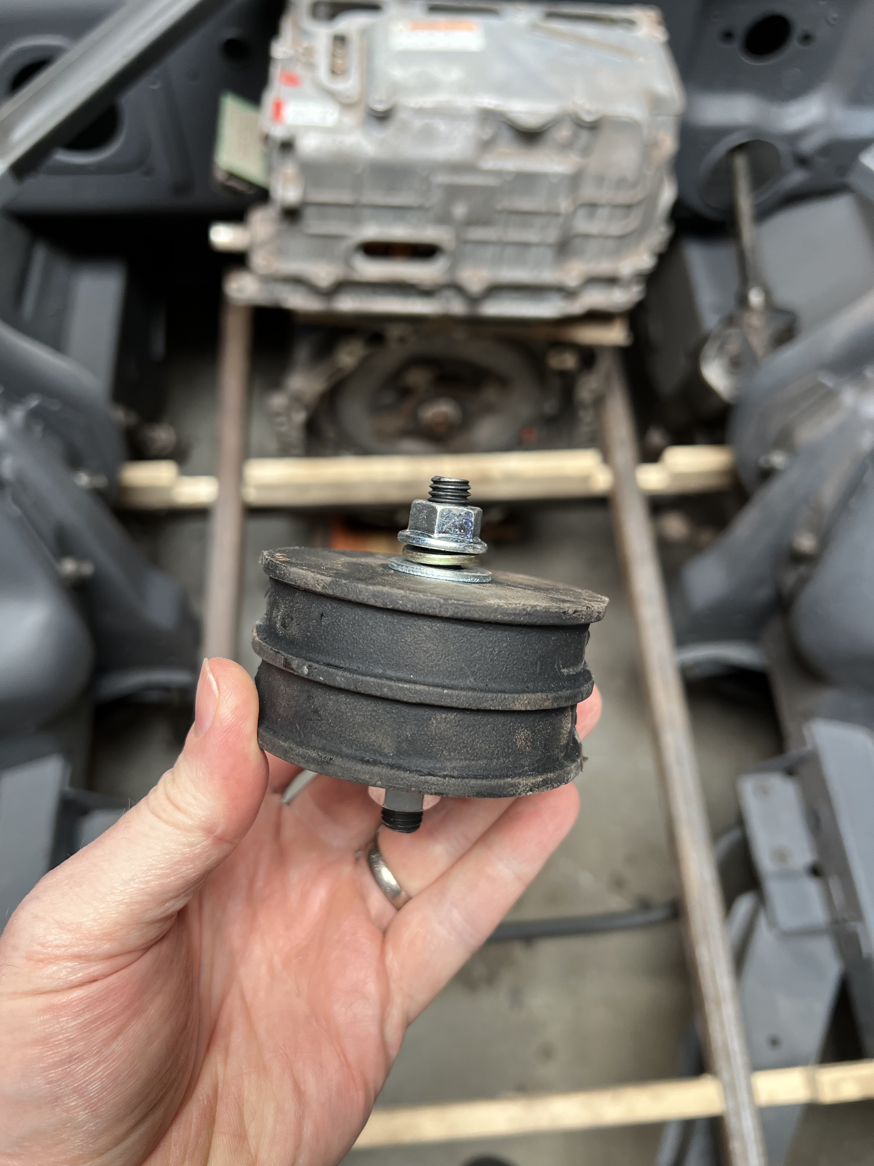 The frame will cantilever out from the engine mount toward the bell housing of the motor (towards the rear of the car). I’ll attach a big piece of angle iron to the front face of the bell housing and sandwich two rubber isolators between the other face of the angle iron and the frame. It’s probably not technically required to dampen the motor like this as it shouldn’t make much in the way of vibrations, but better to do it now than have to change it later.