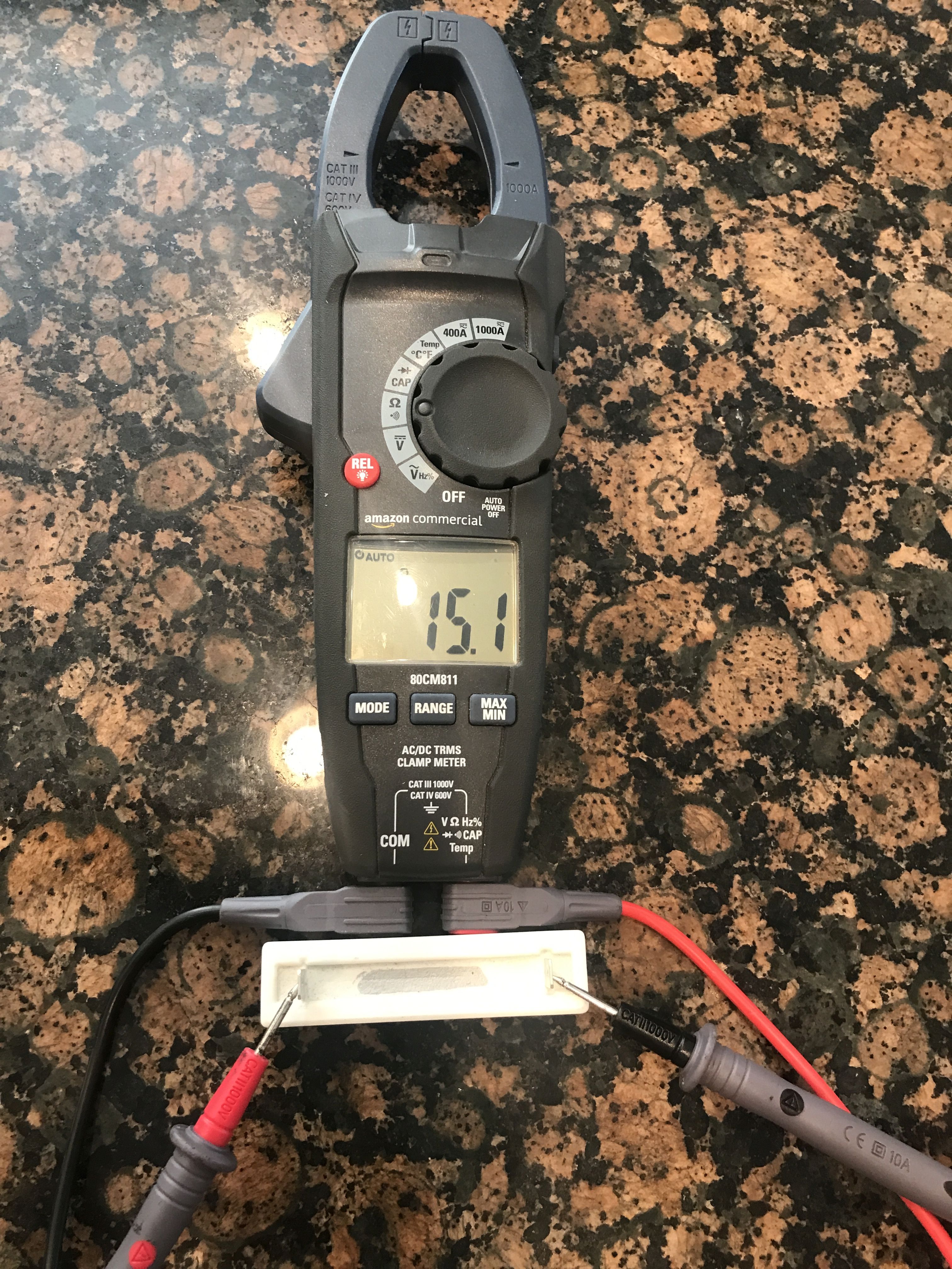 the BMW 530e Safety Box aka the contactor box comes with a 15 Ohms resistor, and this is what a good 15 ohm resistor reading looks like