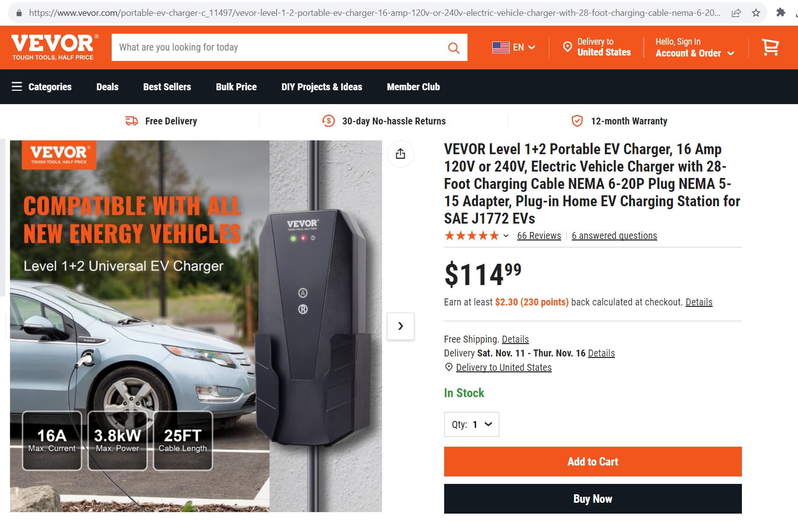 Electric Vehicle Charger with 28-Foot Charging Cable NEMA 6-20P Plug NEMA 5-15 Adapter
