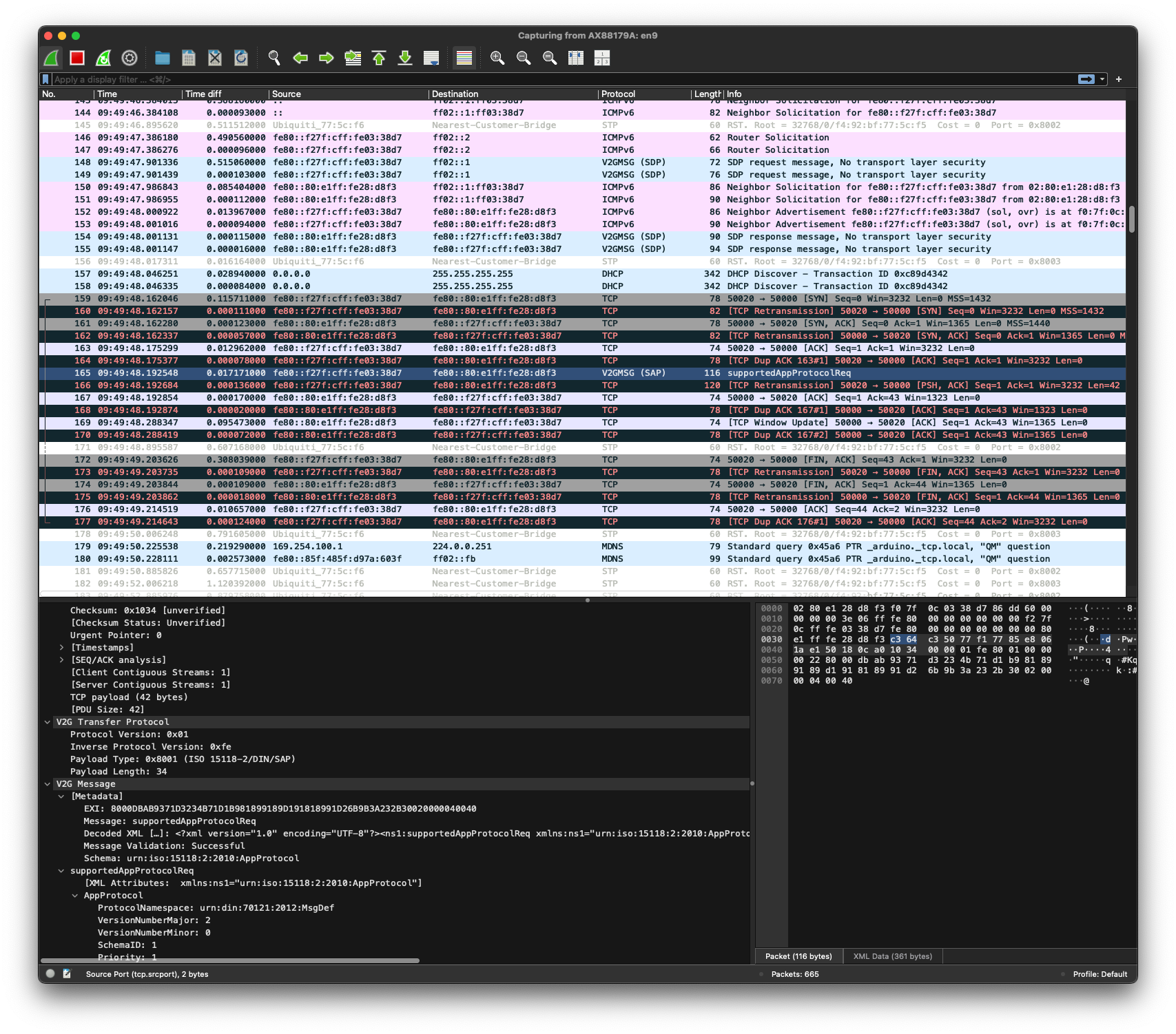 We are now testing the ISO 15118 connectivity, but we can't seem to receive any SLAC attenuation REQ from the LIM. We provide 5% PWM to the CP and we can see the state going into `CCS Comms` for a few seconds while the cable is locked, but then it unlocks the cable and gets into `5% DC` state and stays there forever. Even if we send charge command, it goes flashing yellow (charging), but we can't establish a PLC communication with it....