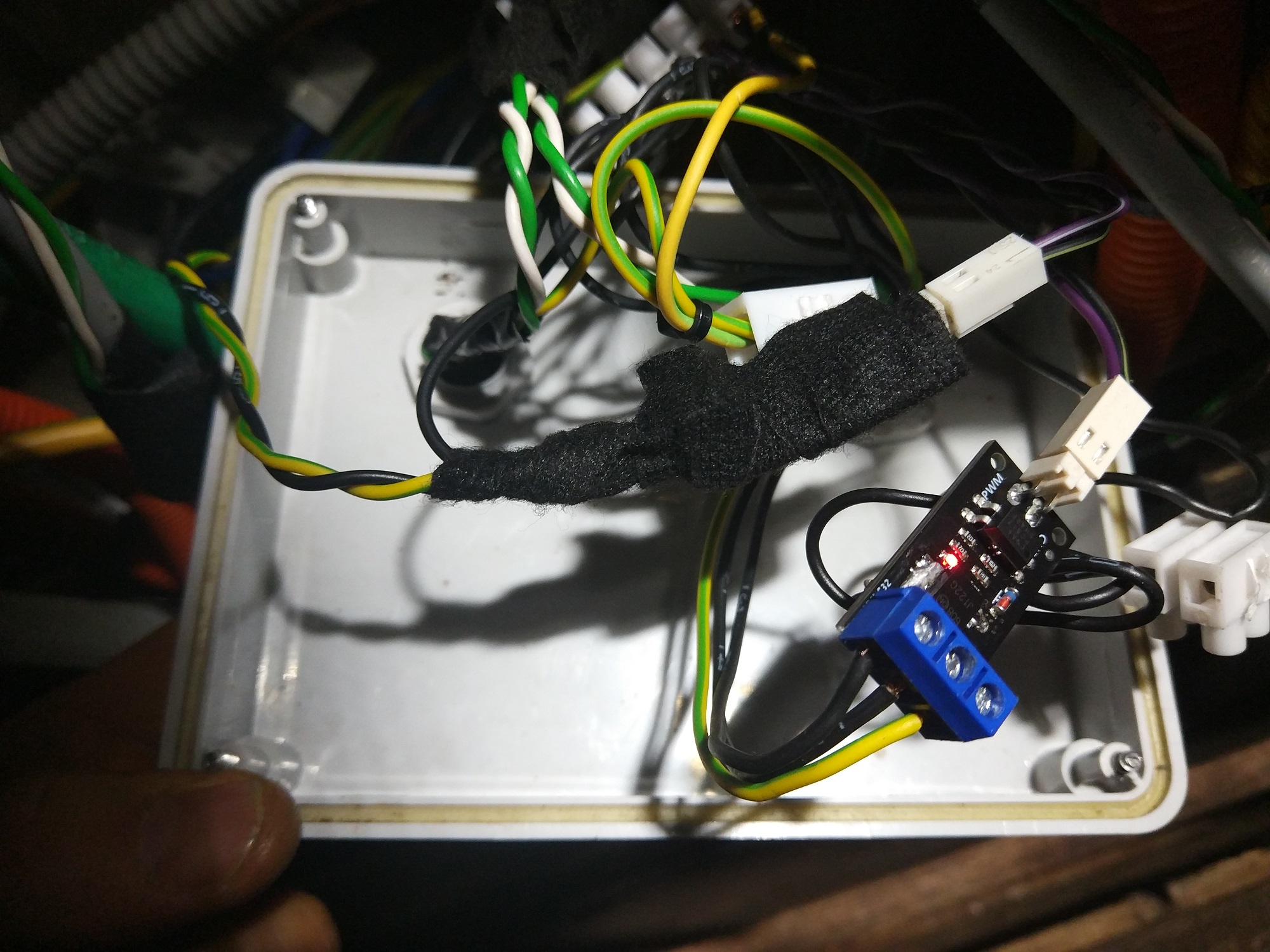 I put both transistor modules down in the box with the chargers. PWM signal is fed on a single line and then transistors split the signal to each charger.