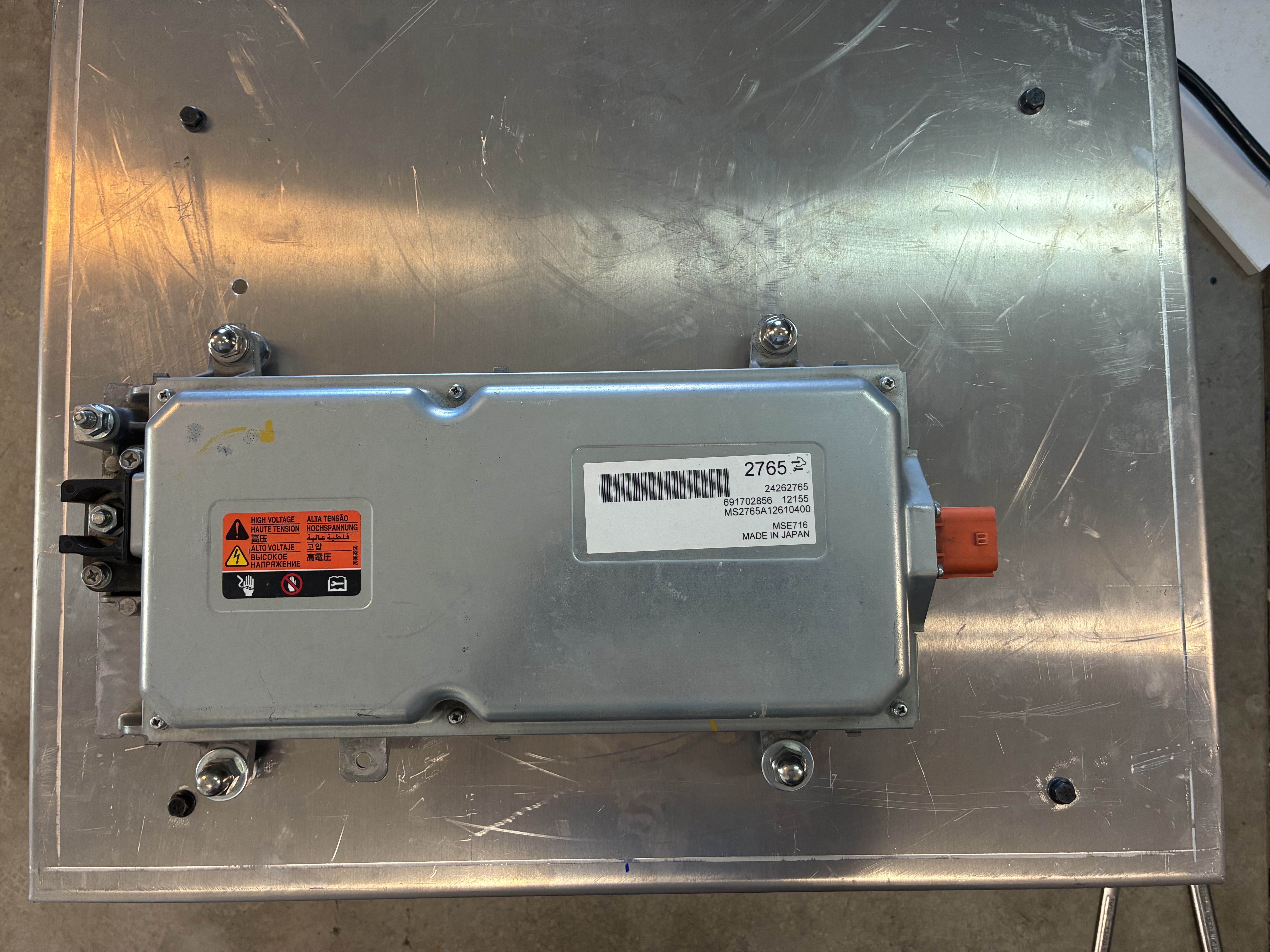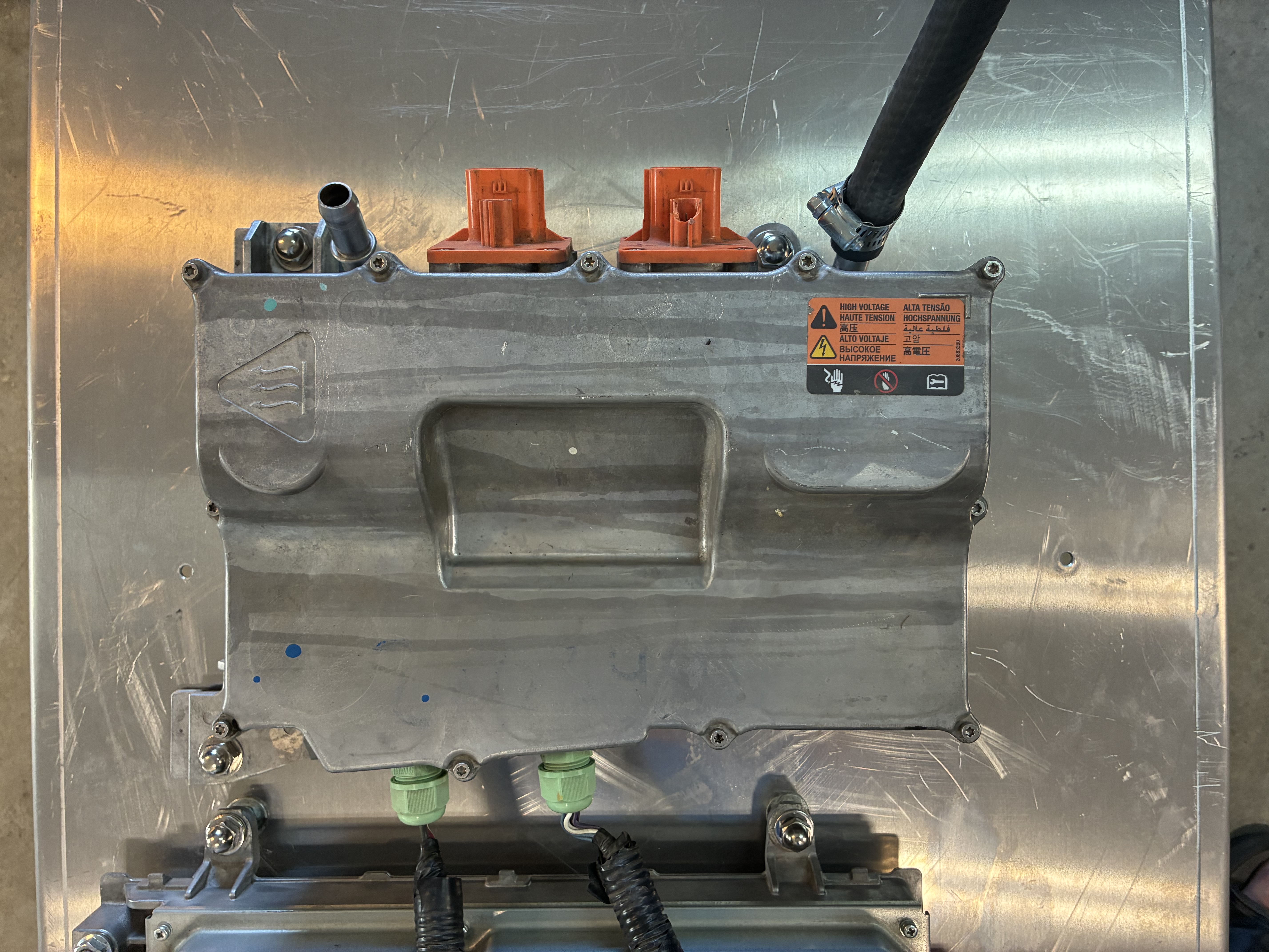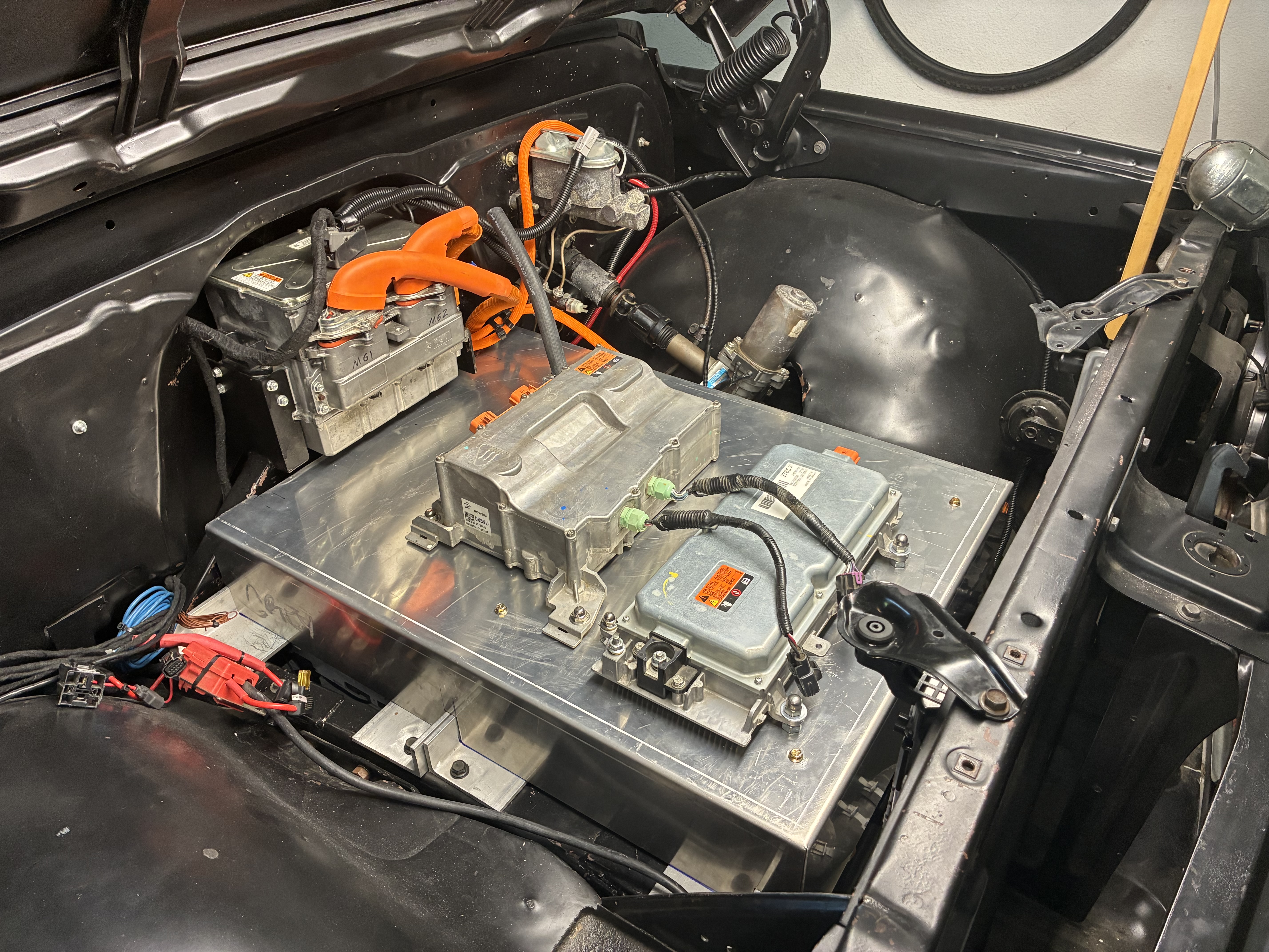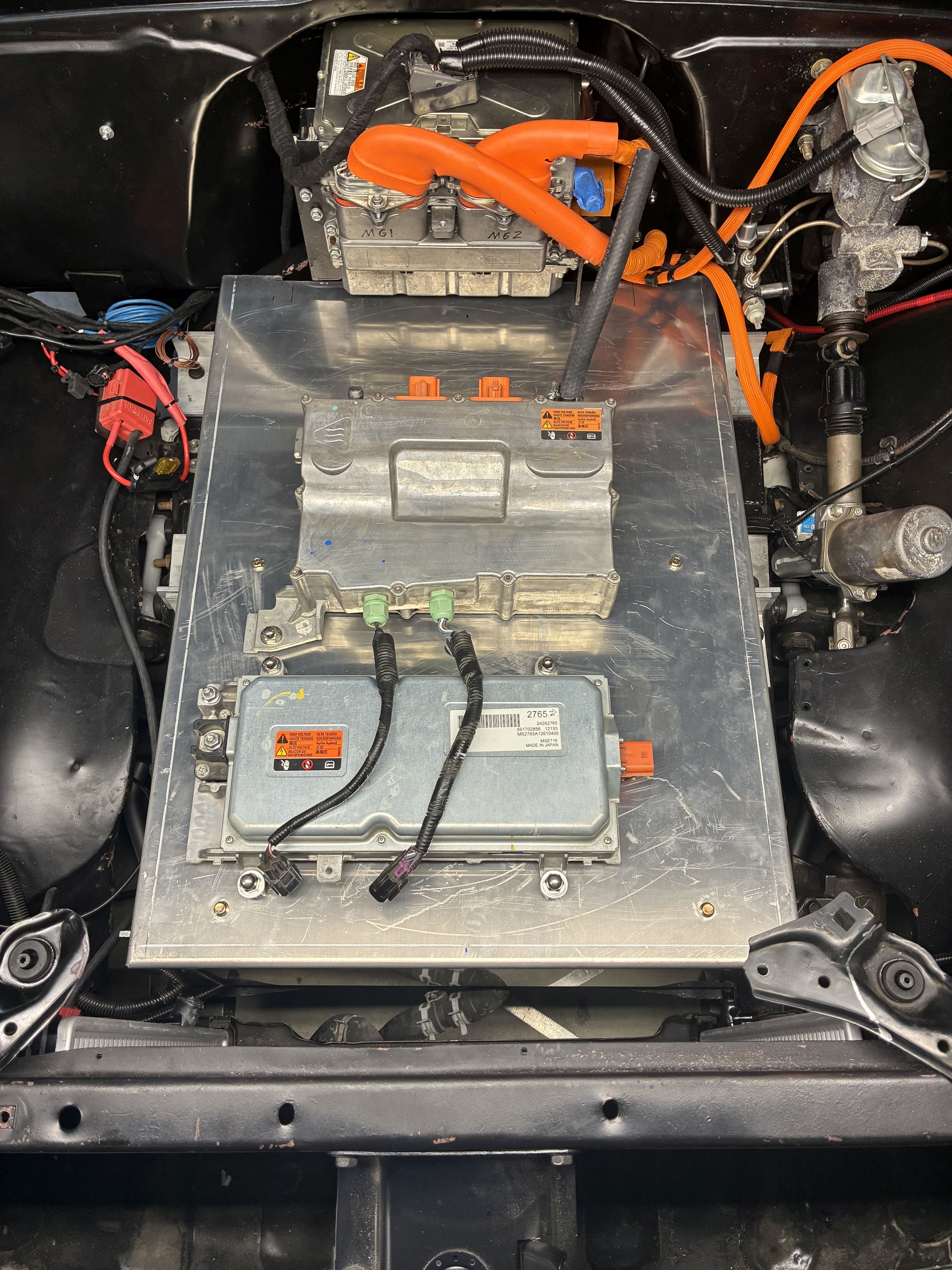 here I am remounting the 1st Gen Chevy Volt DC-DC converter (for now) with my beloved acorn nuts, which turned out to be way more P.I.A. than it's worth, I highly do NOT recommend using them as the bolts have to be perfect or a bit shorter length to allow full tightfullness or they will bottom or should I say top out !